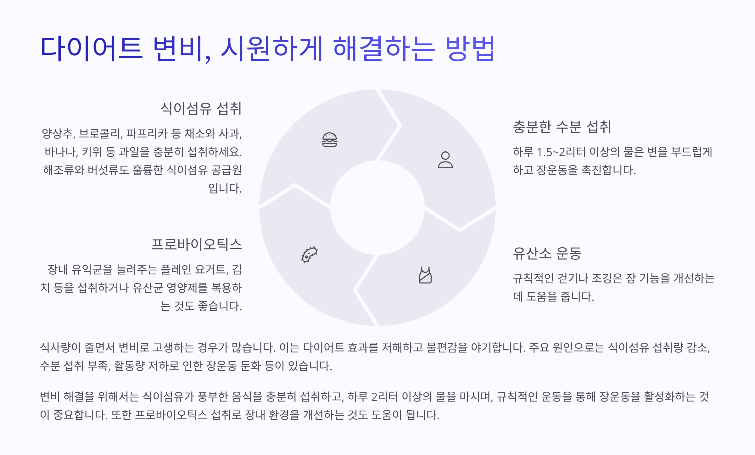 식사량이 줄면서 변비로 고생하는 경우가 많습니다. 이는 다이어트 효과를 저해하고 불편감을 야기합니다.
