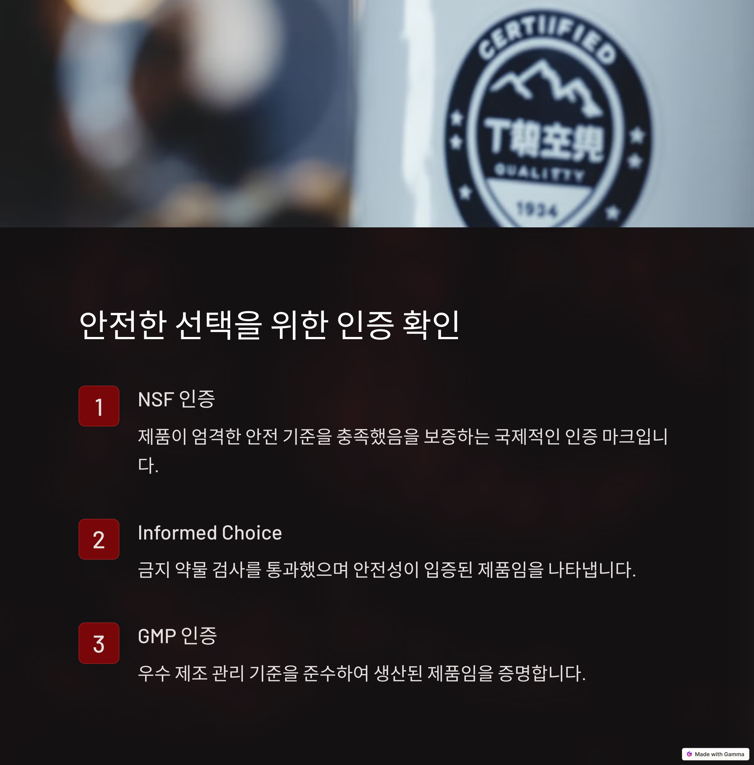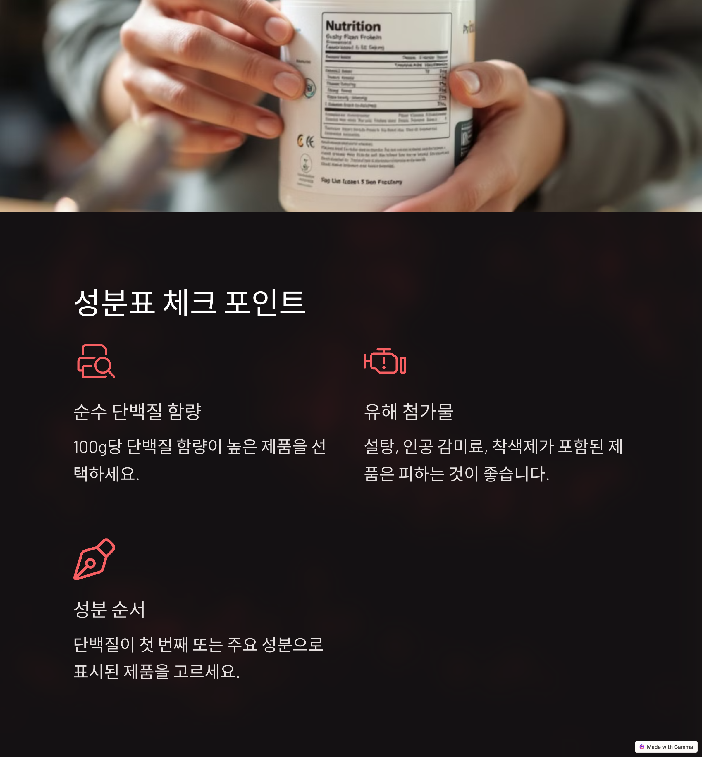 | 분리유청, 카제인, 식물성 단백질 등 | 설탕, 감미료, 착색제 유무 확인 | NSF, Informed Choice 인증 확인 |