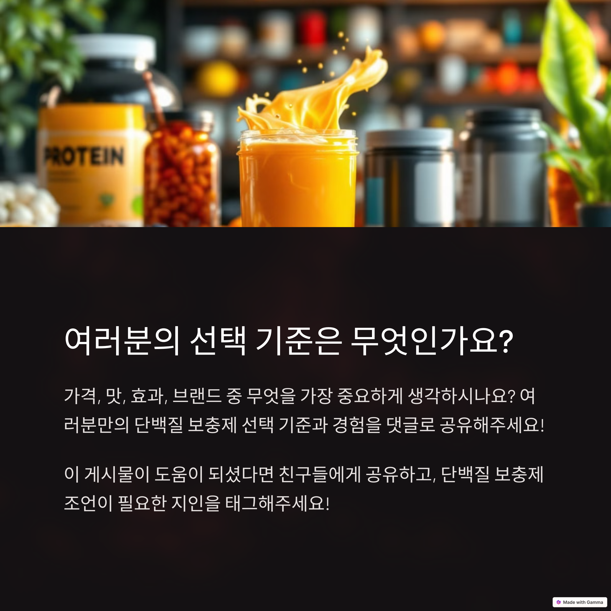 단백질 보충제를 고를 때 어떤 기준을 가장 중요하게 생각하시나요? 댓글로 여러분의 경험과 의견을 공유해 주세요!