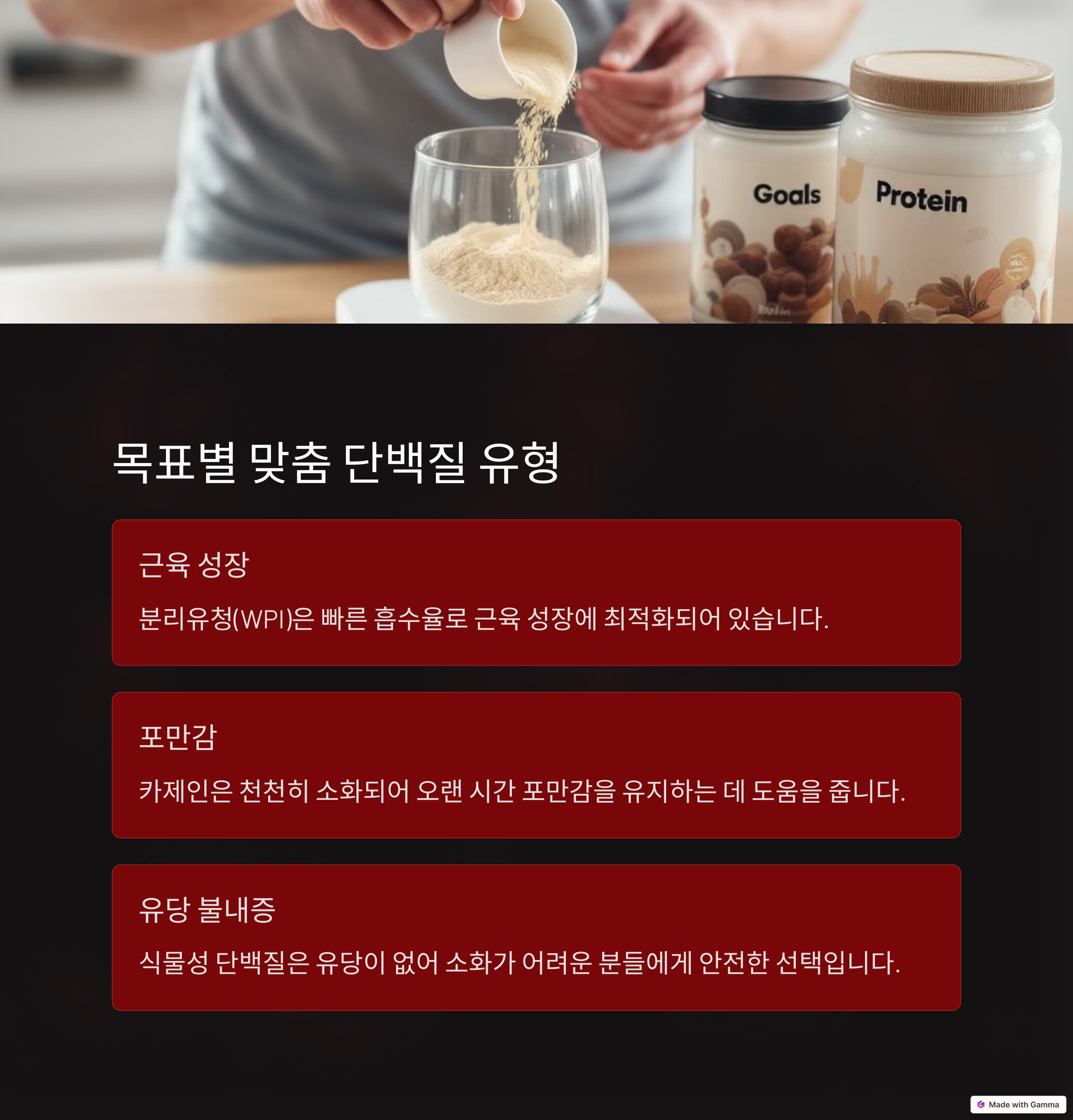 | 단백질 종류 | 분리유청, 농축유청, 카제인 등 다양한 단백질 유형이 존재 |