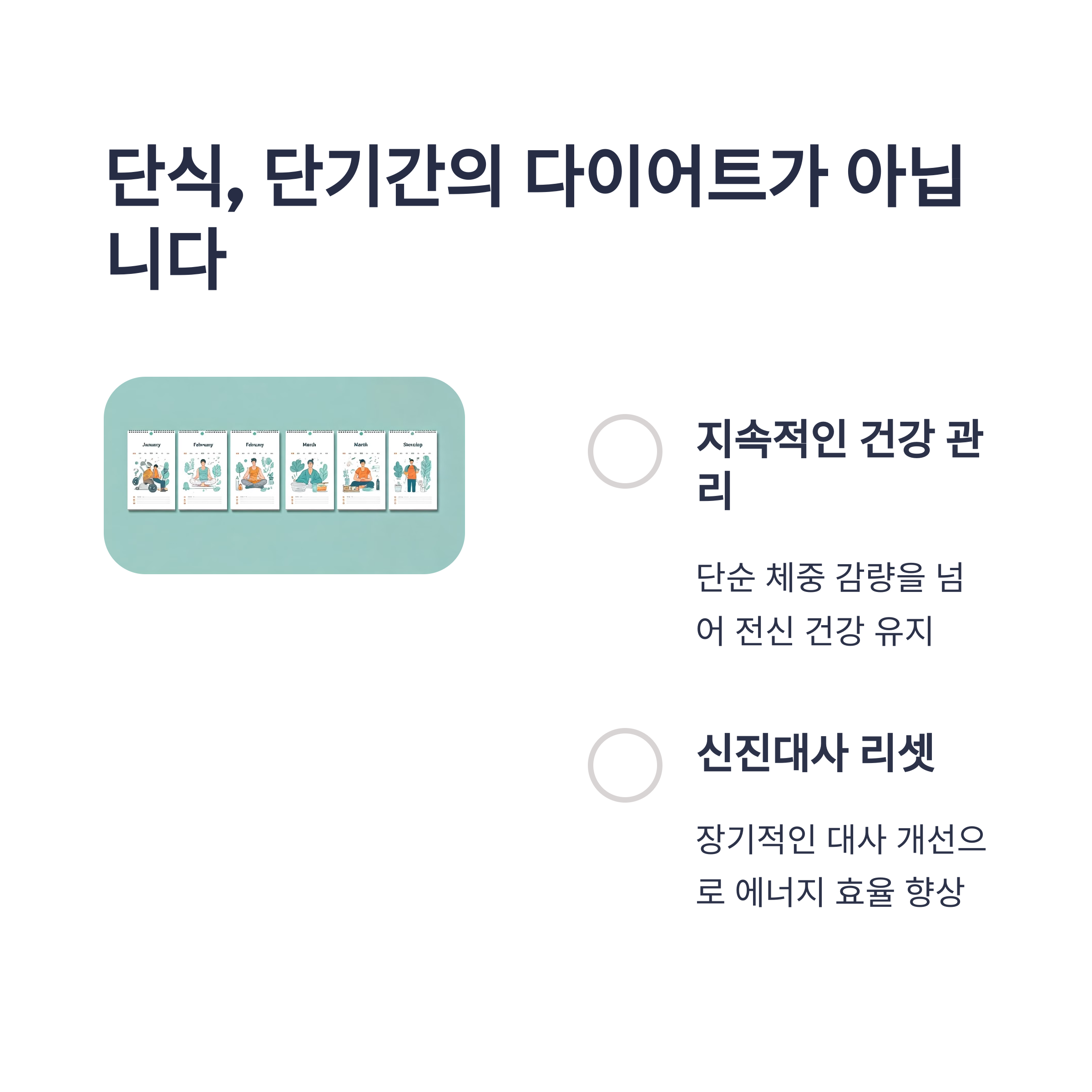 단식은 단순히 체중 감소를 위한 방법이 아니라, 신체 회복을 돕고 신진대사를 활성화시켜 건강한 체형을 유지하는 데 중요한 역할을 합니다. 단식을 통해 신진대사가 개선되면, 장기적인 면역력 향상과 세포 재생이 촉진되어 더 건강한 몸을 유지할 수 있습니다.