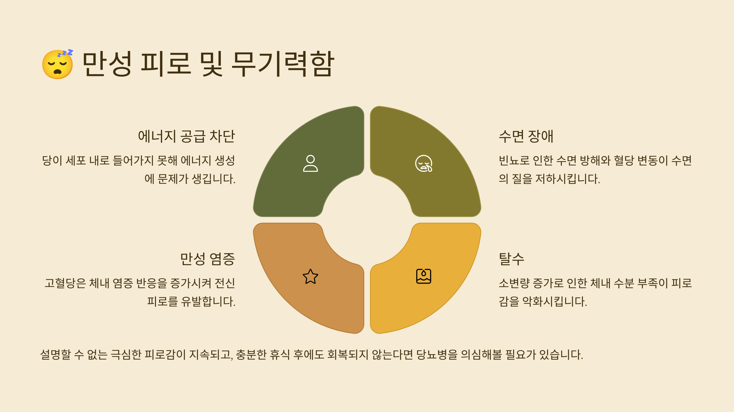 자가 체크 팁: 특별한 원인 없이 몇 주 이상 만성적인 피로와 무기력함이 지속된다면 혈당 검사를 고려해 보세요. 이는 다른 질환의 증상일 수도 있으니 정밀 검사가 필요해요.
