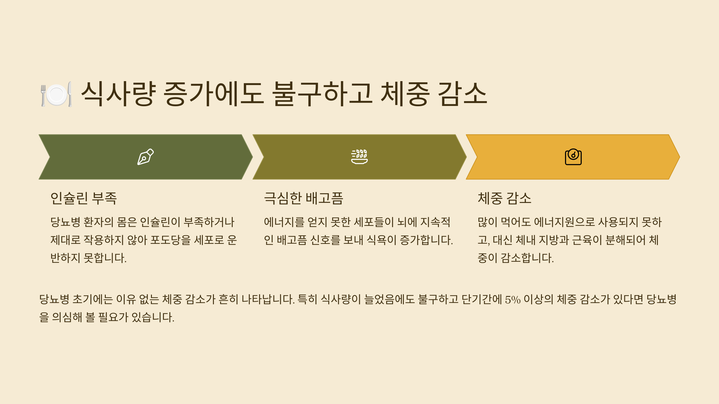 평소보다 많이 먹는데도 불구하고 오히려 체중이 줄어든다면, 당뇨병 초기 증상일 수 있어요. 이를 '다식(多食)'과 '체중 감소'라고 부른답니다. 🍚⬇️