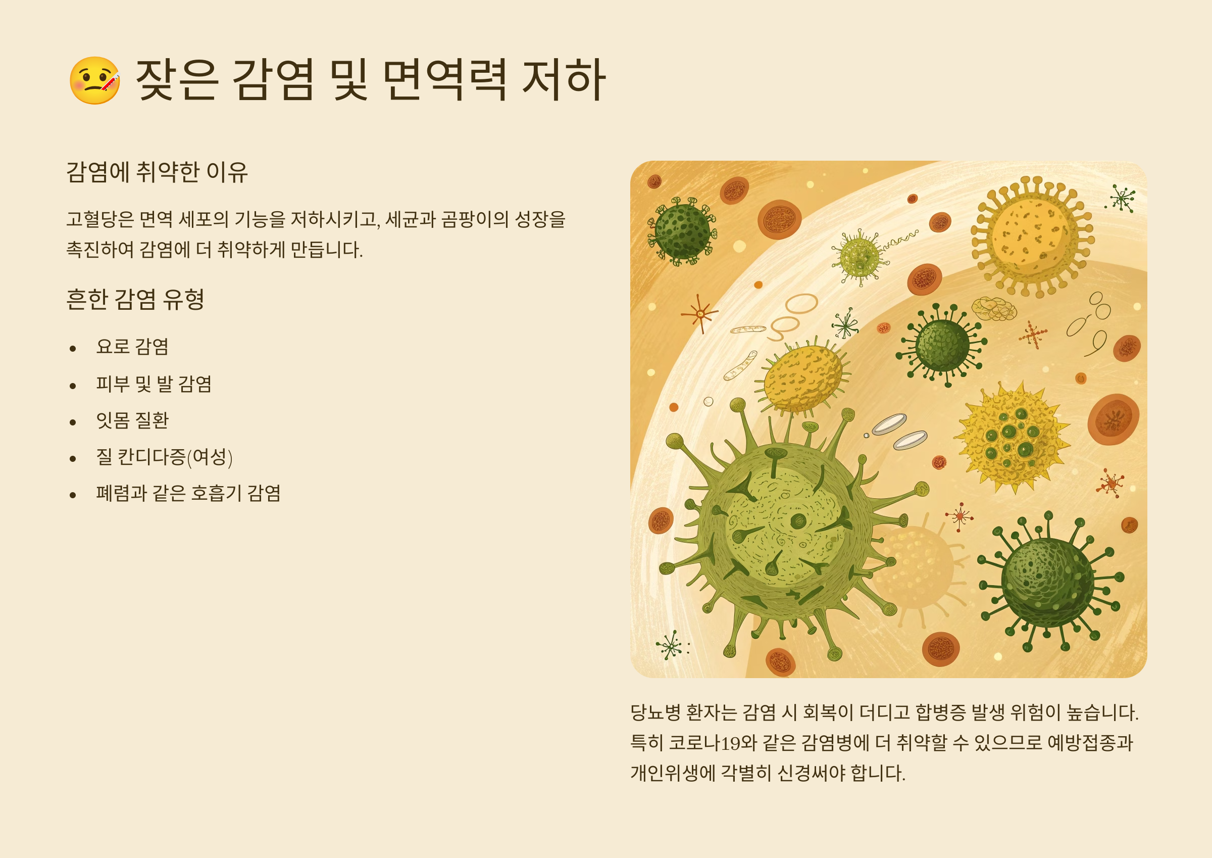 원인: 높은 혈당은 면역 세포의 기능을 약화시켜요. 혈액 속 포도당은 세균이나 곰팡이의 좋은 영양원이 되어 감염에 취약하게 만들죠. 특히 소변으로 배출되는 당분은 요로계 감염 위험을 높인답니다.