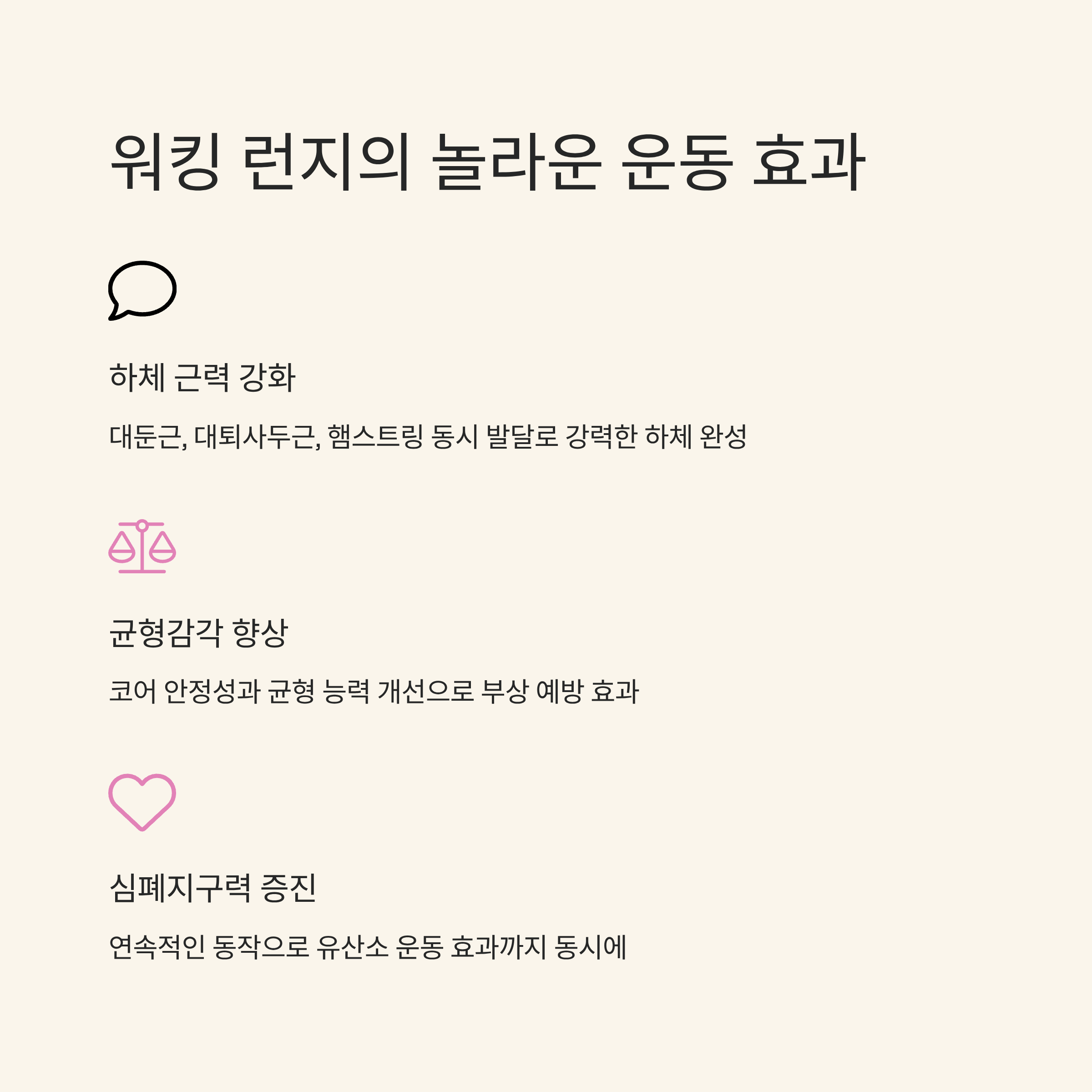 한 발씩 번갈아 가며 나아가는 동작은 몸의 균형을 유지하기 위한 코어 근육(복근, 허리)과 안정근의 활성화를 요구합니다. 꾸준한 워킹 런지는 균형 감각을 향상시키고 코어 근육을 강화하여 낙상 예방 및 자세 교정에도 도움을 줍니다.