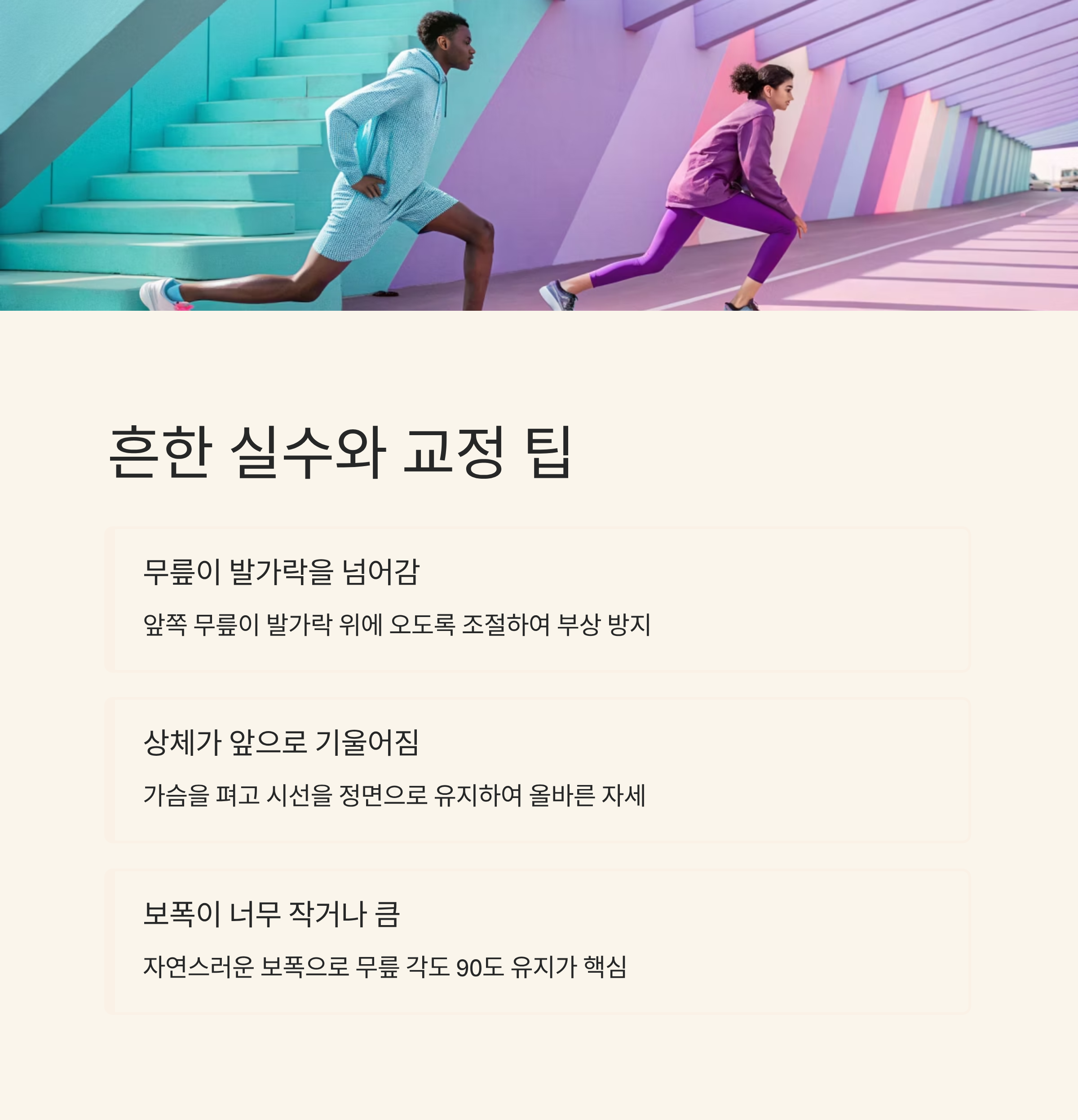 | 주의할 실수 | 앞 무릎 발끝 과도하게 넘어감, 상체 굽힘/젖힘, 얕은 런지, 무릎 흔들림 | 거울 보며 자세 확인, 보폭 조절, 복근 힘주기, 천천히 동작 수행 |