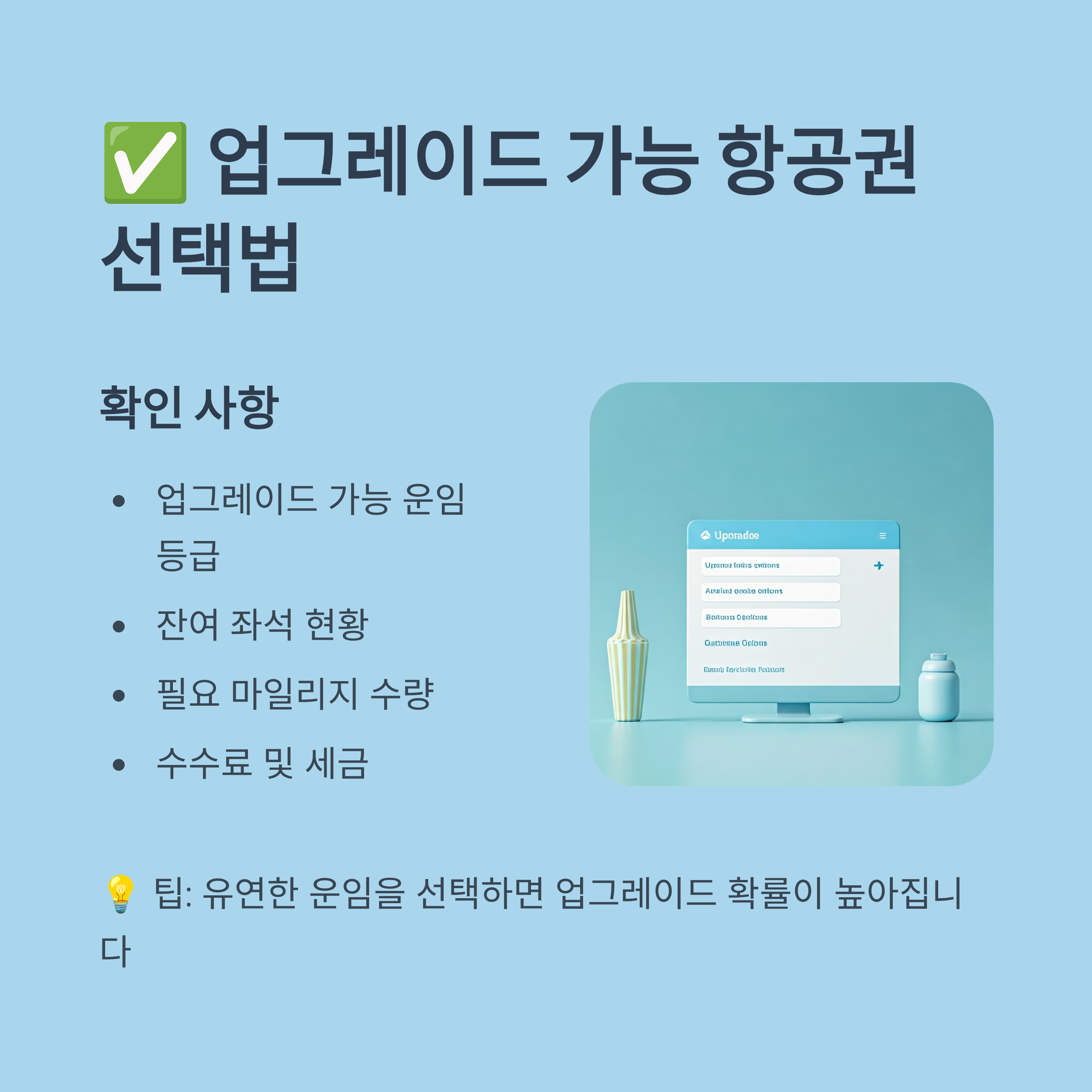 마일리지 업그레이드는 좌석 가용성에 따라 결정되므로, 몇 가지 노하우를 활용하면 성공률을 높일 수 있습니다.