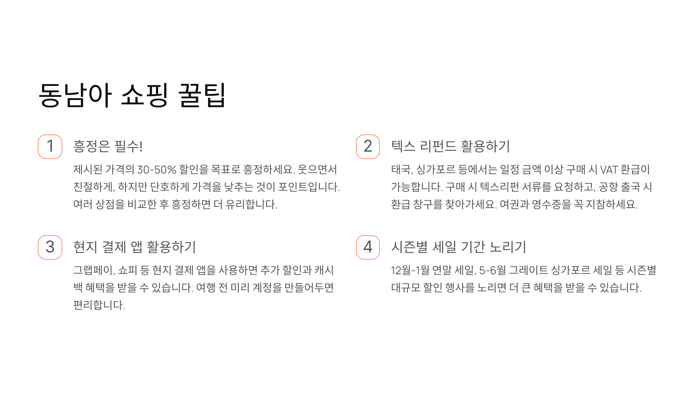 셋째, 다양한 품목과 고유한 기념품이에요. 동남아시아는 각국의 전통 공예품, 열대과일, 향신료, 특산물 등 그 나라에서만 구할 수 있는 독특한 기념품이 많아 선물용으로도 매우 좋아요. 실크 제품, 천연 비누, 커피, 차 등 쇼핑리스트가 끝없이 늘어날 거예요!