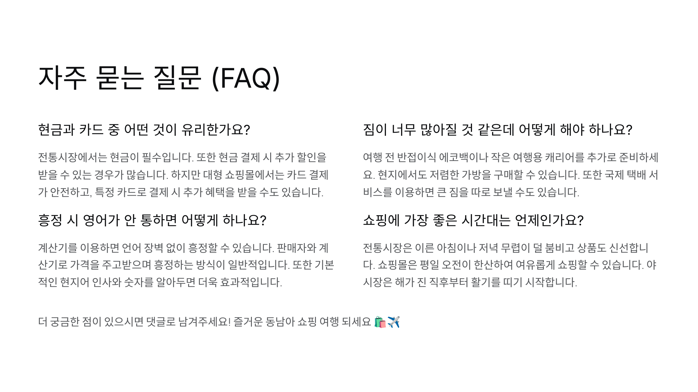 이처럼 동남아시아에서의 쇼핑은 저렴한 가격, 특별한 경험, 그리고 다양한 품목이 어우러져 여행의 즐거움을 배가시켜 준답니다. 😊