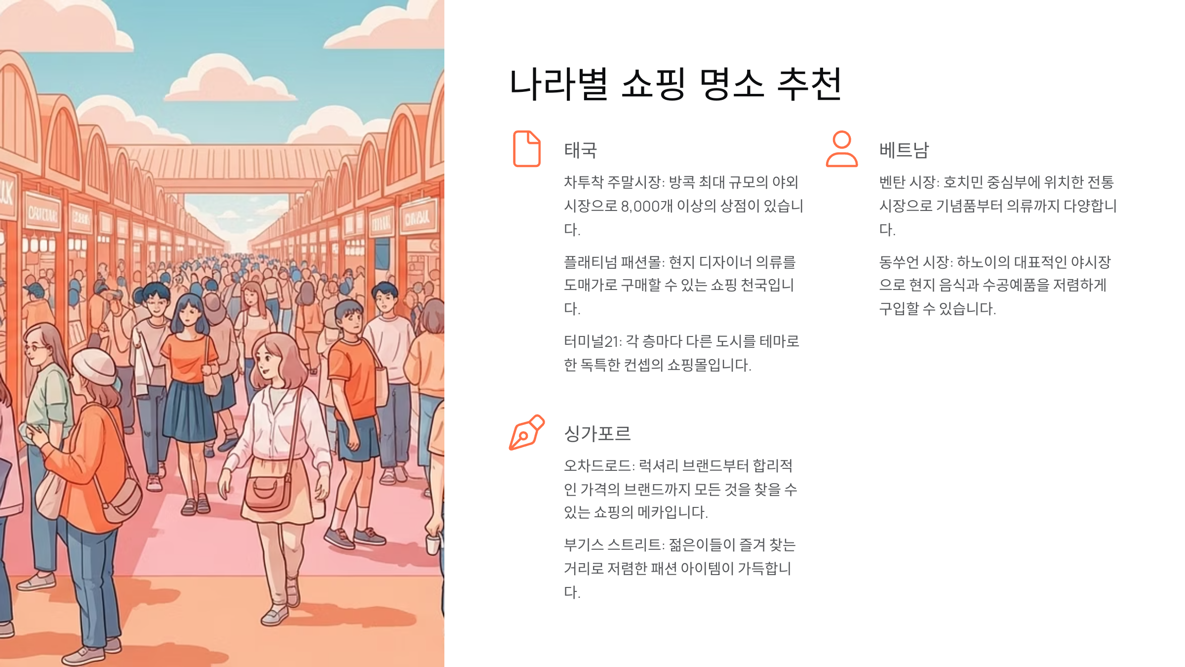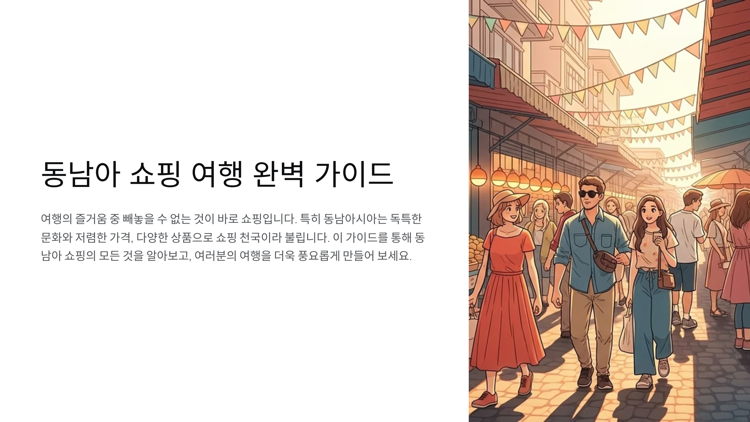 이 글에서는 태국, 베트남, 말레이시아, 싱가포르, 필리핀, 인도네시아 등 주요 동남아 국가들의 대표적인 쇼핑 명소들을 소개하고, 현지에서 스마트하게 쇼핑할 수 있는 실질적인 팁들을 알려드릴게요. 텍스리펀부터 흥정 기술까지, 동남아 쇼핑을 200% 즐길 수 있도록 모든 정보를 담았습니다! ✨