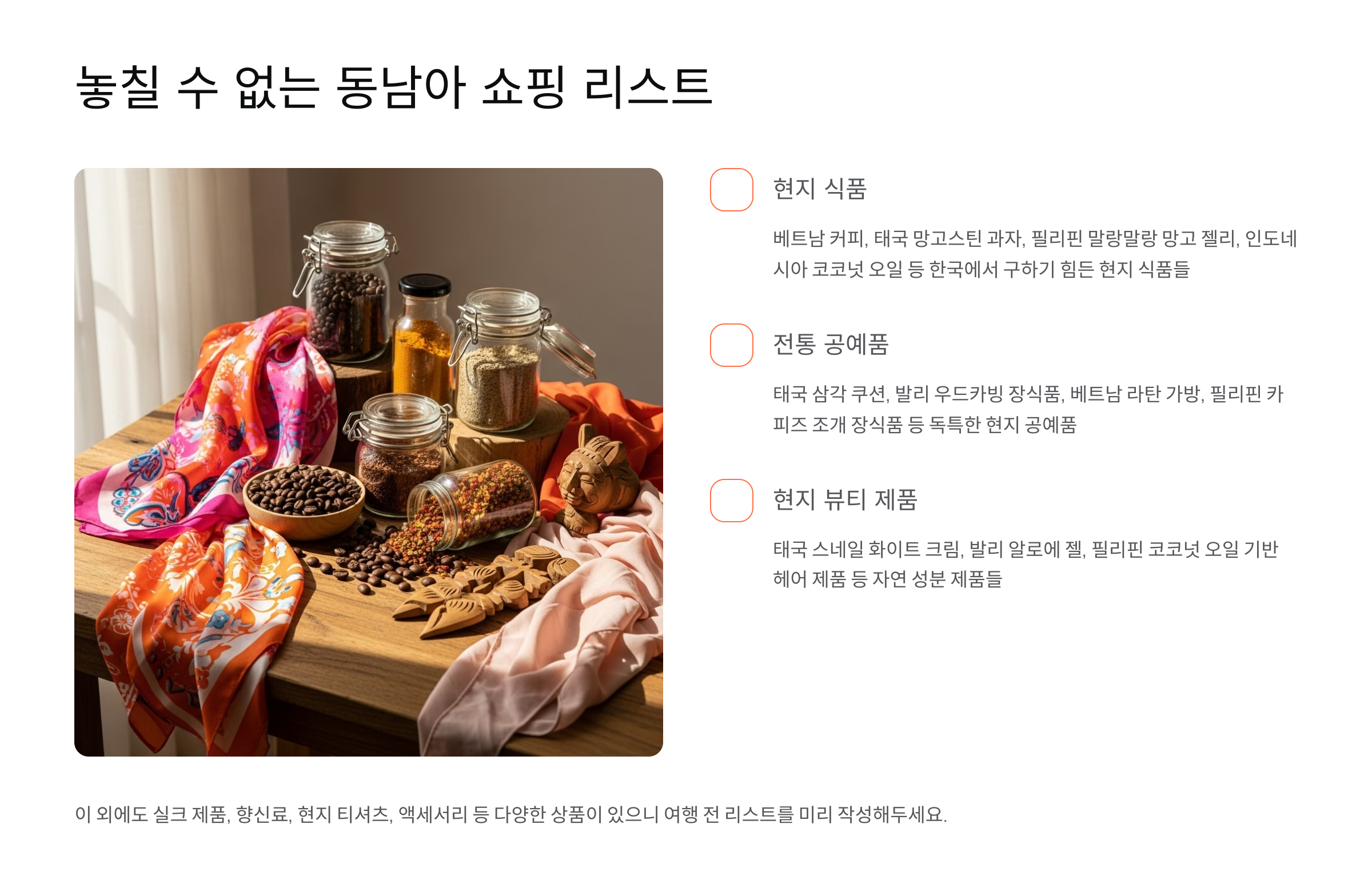 동남아시아 여행 시 꼭 사와야 할 인기 쇼핑리스트를 소개합니다. 현지에서만 만날 수 있는 특별한 아이템들을 놓치지 마세요!