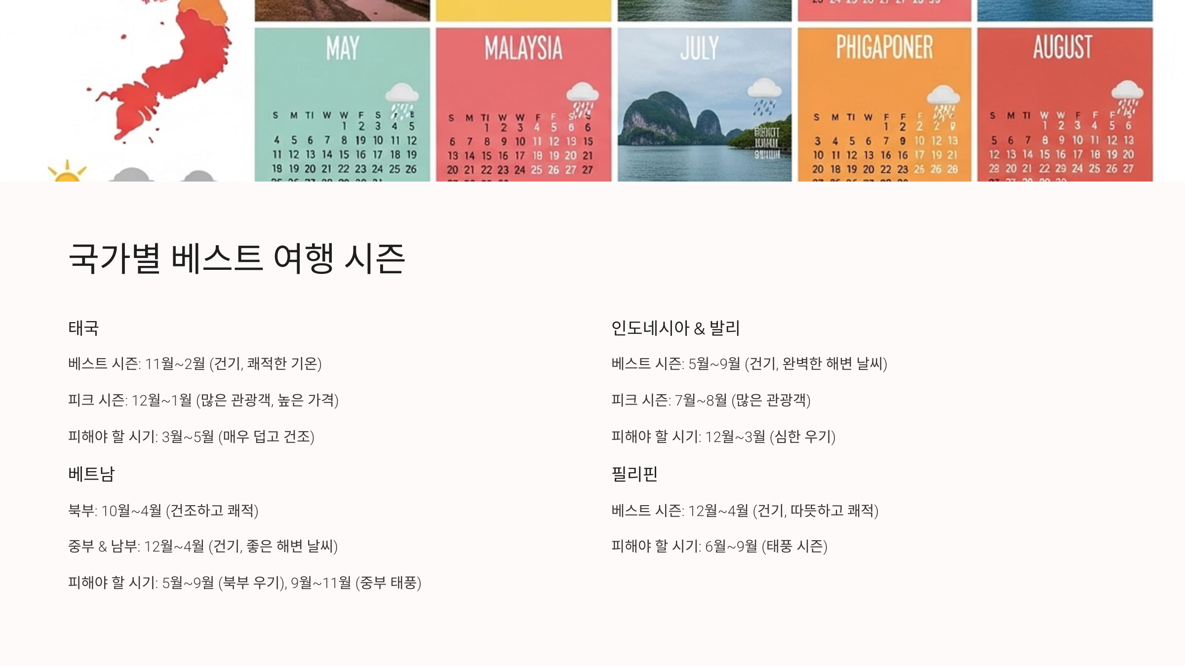 가장 인기 있는 동남아시아 국가들의 최적 여행 시기를 정리했습니다.