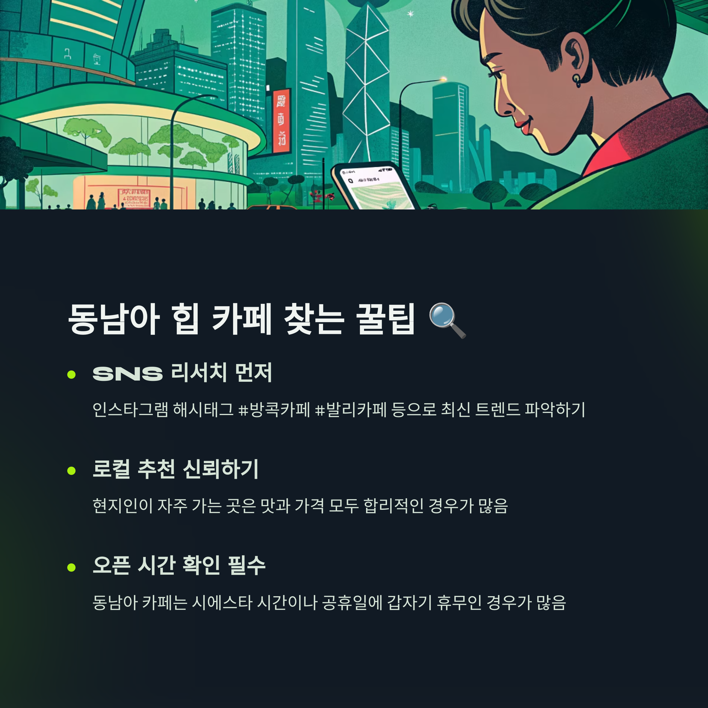 위에서 소개한 카페 외에도 동남아에는 무수히 많은 힙한 카페들이 숨어있습니다. 나만의 보물 같은 카페를 찾아낼 수 있는 몇 가지 팁을 알려드릴게요!