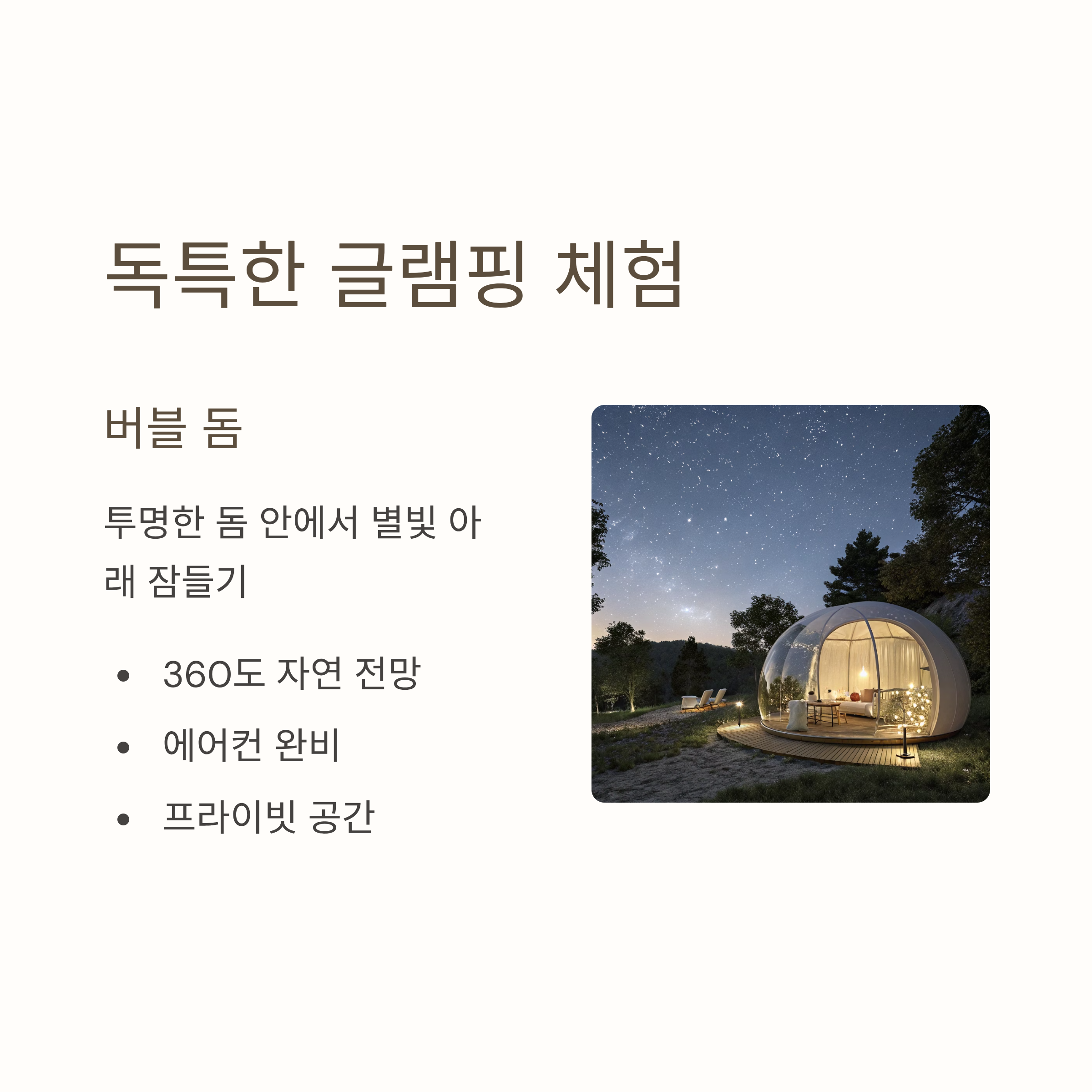 ⛺ 독특한 글램핑: 버블 돔 & 럭셔리 텐트