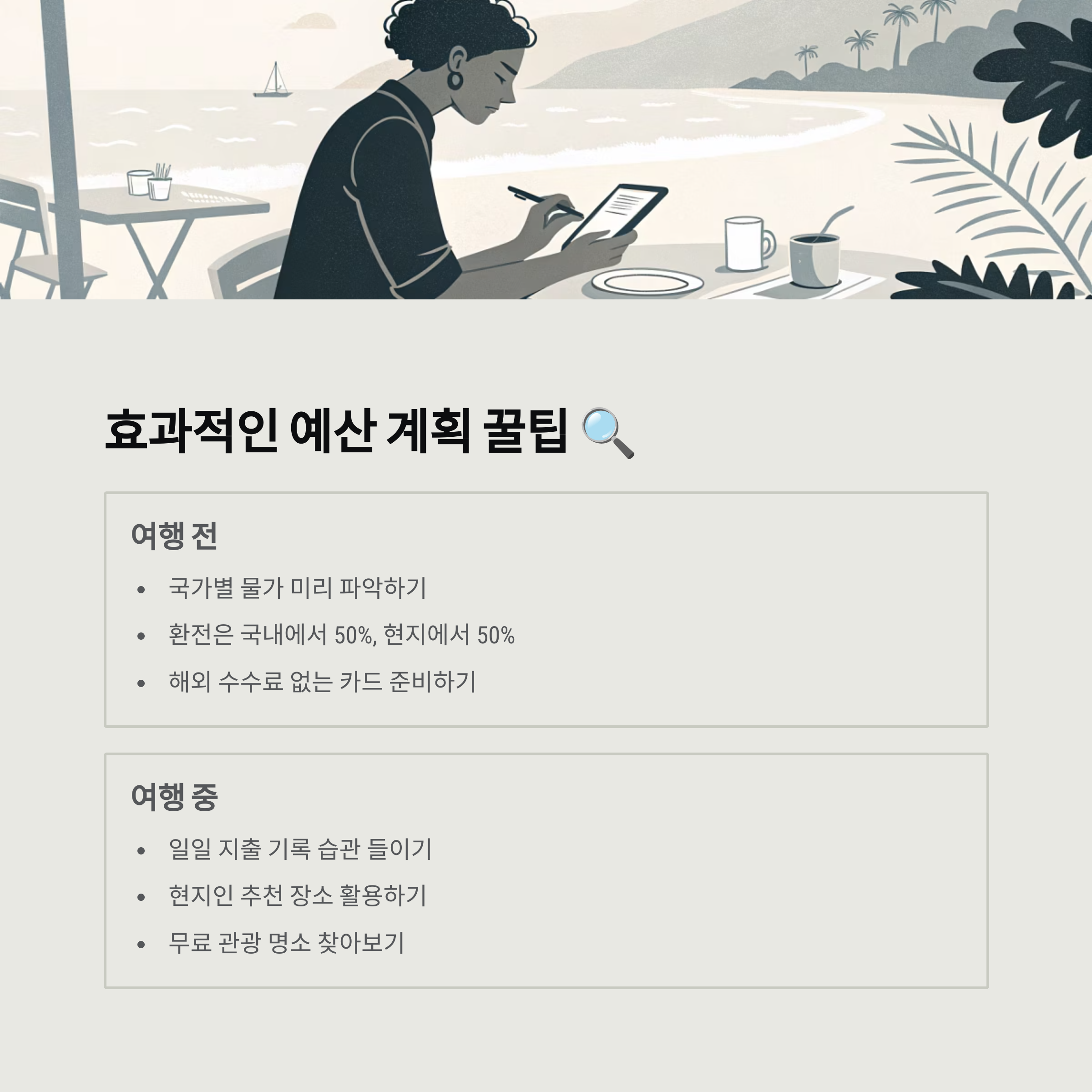 - 일일 예산 설정: 하루에 사용할 예산을 정해두고 가급적 그 범위 내에서 지출하려고 노력하세요. 예를 들어 숙소, 식사, 교통, 액티비티 등 카테고리별로 예산을 할당해두면 좋아요.