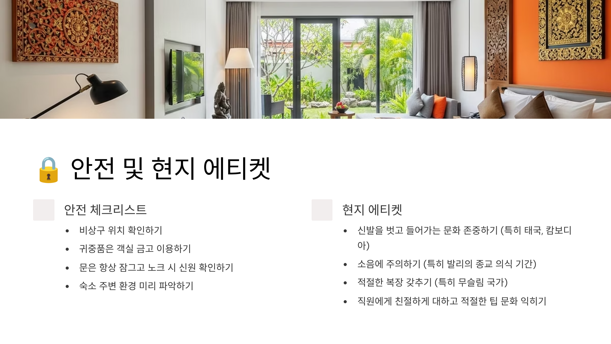 동남아시아는 비교적 안전한 여행지이지만, 낯선 환경에서는 항상 조심해야 해요. 숙소에서의 안전 수칙과 현지에서 알아두면 좋은 에티켓을 미리 숙지하여 더욱 편안하고 즐거운 여행을 만들어 보세요.