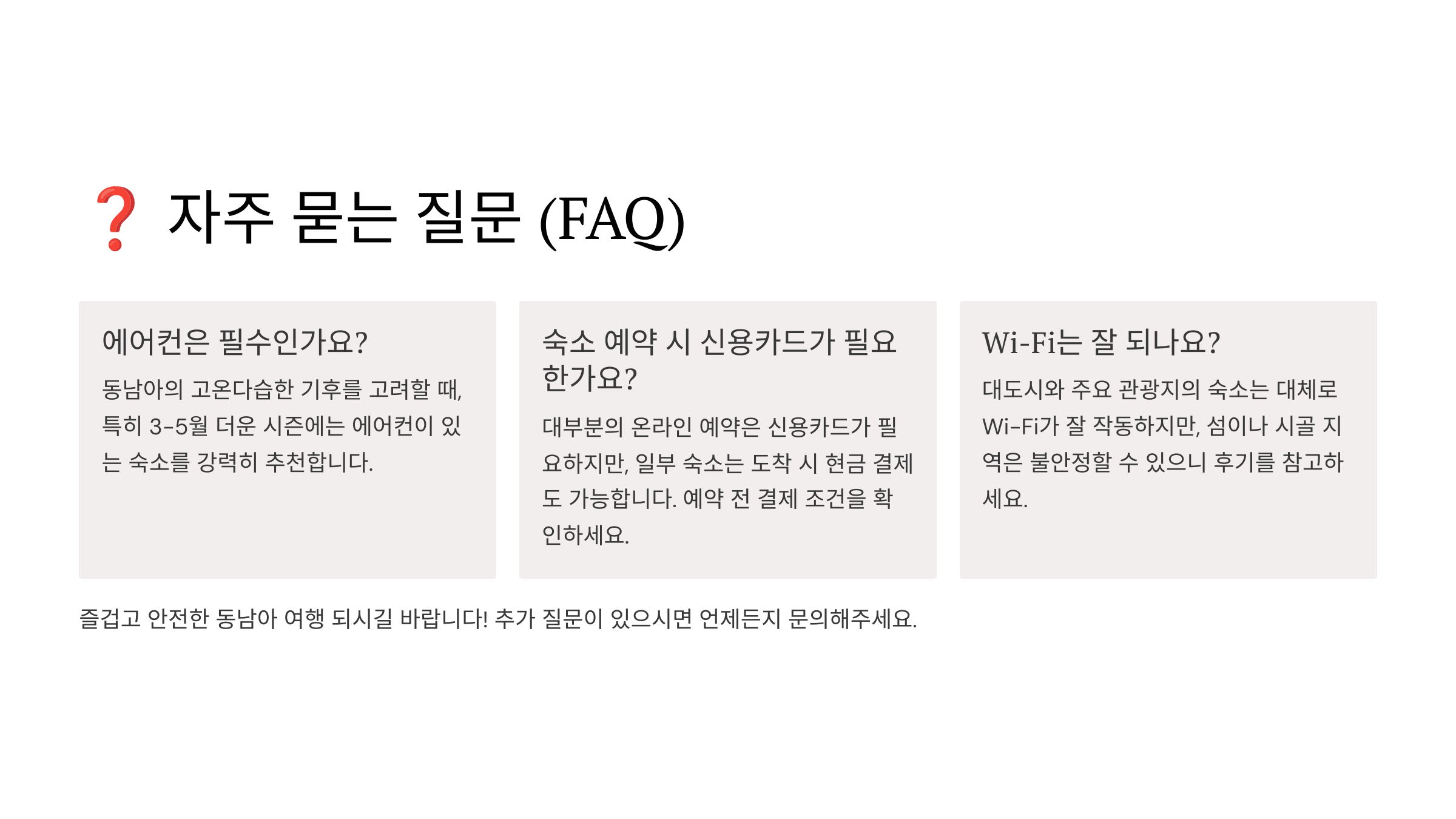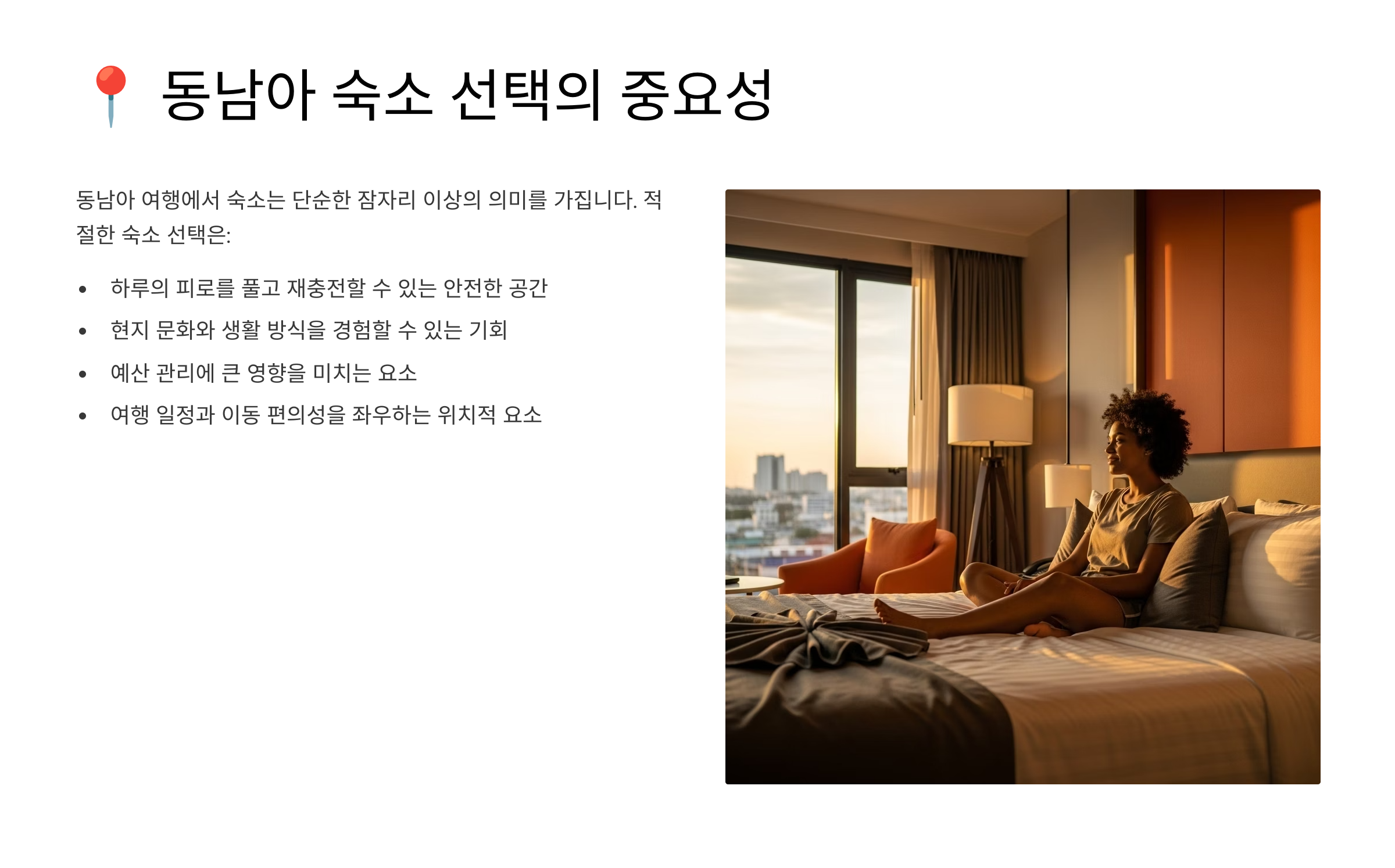 동남아시아 여행의 성공 여부는 숙소 선택에 달려있다고 해도 과언이 아니에요. 현명한 선택으로 최고의 여행을 만들어 보세요! 🌴
