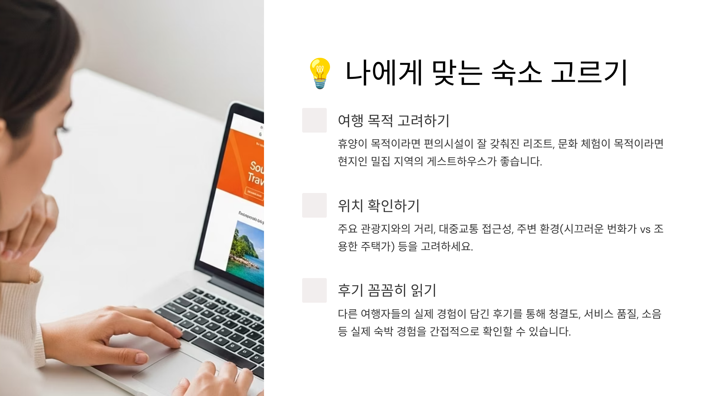 | 여행 목적 | 휴양, 관광, 액티비티, 문화 체험 등 | 목적에 맞는 숙소 유형 선택 |