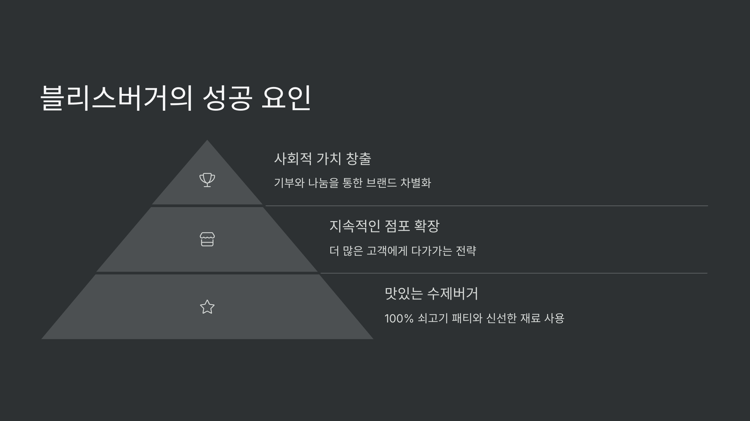 | 블리스버거의 성공 요인은 두 가지로 요약됩니다. 첫째, 맛있는 수제버거로 고객들에게 신뢰를 얻었습니다. 둘째, 사회적 기부 활동을 통해 브랜드 이미지를 상승시켰습니다. 또한, 지속적인 점포 확장을 통해 더 많은 고객들에게 다가갔습니다. 100% 쇠고기 패티의 품질 보장과 신선한 재료 사용도 중요한 성공 요인입니다. 마지막으로, 고객들과의 긴밀한 소통과 투명성을 유지하고 있습니다. |