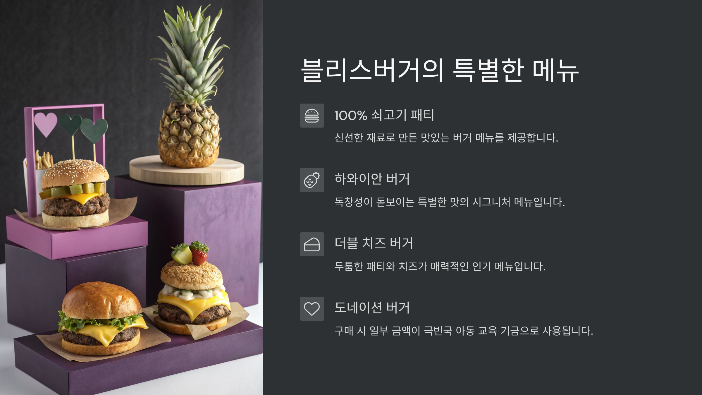 이곳은 단순히 맛있는 버거를 제공하는 것에 그치지 않고, 사회적 기부 활동까지 실천하며, 맛과 나눔을 모두 경험할 수 있는 특별한 장소입니다.