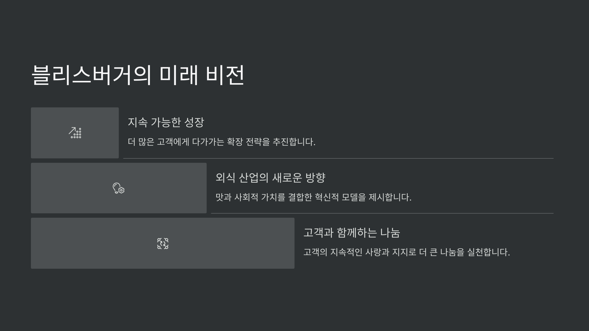 블리스버거는 앞으로도 지속 가능한 성장을 통해 더 많은 고객들에게 다가갈 것입니다.