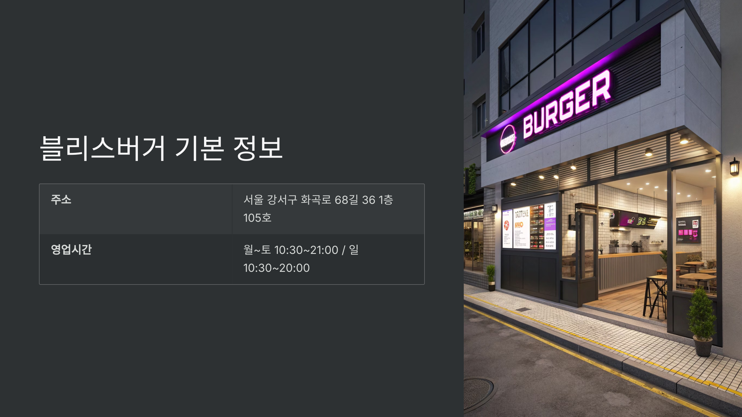| 주소 | 서울 강서구 화곡로 68길 36 1층 105호 |