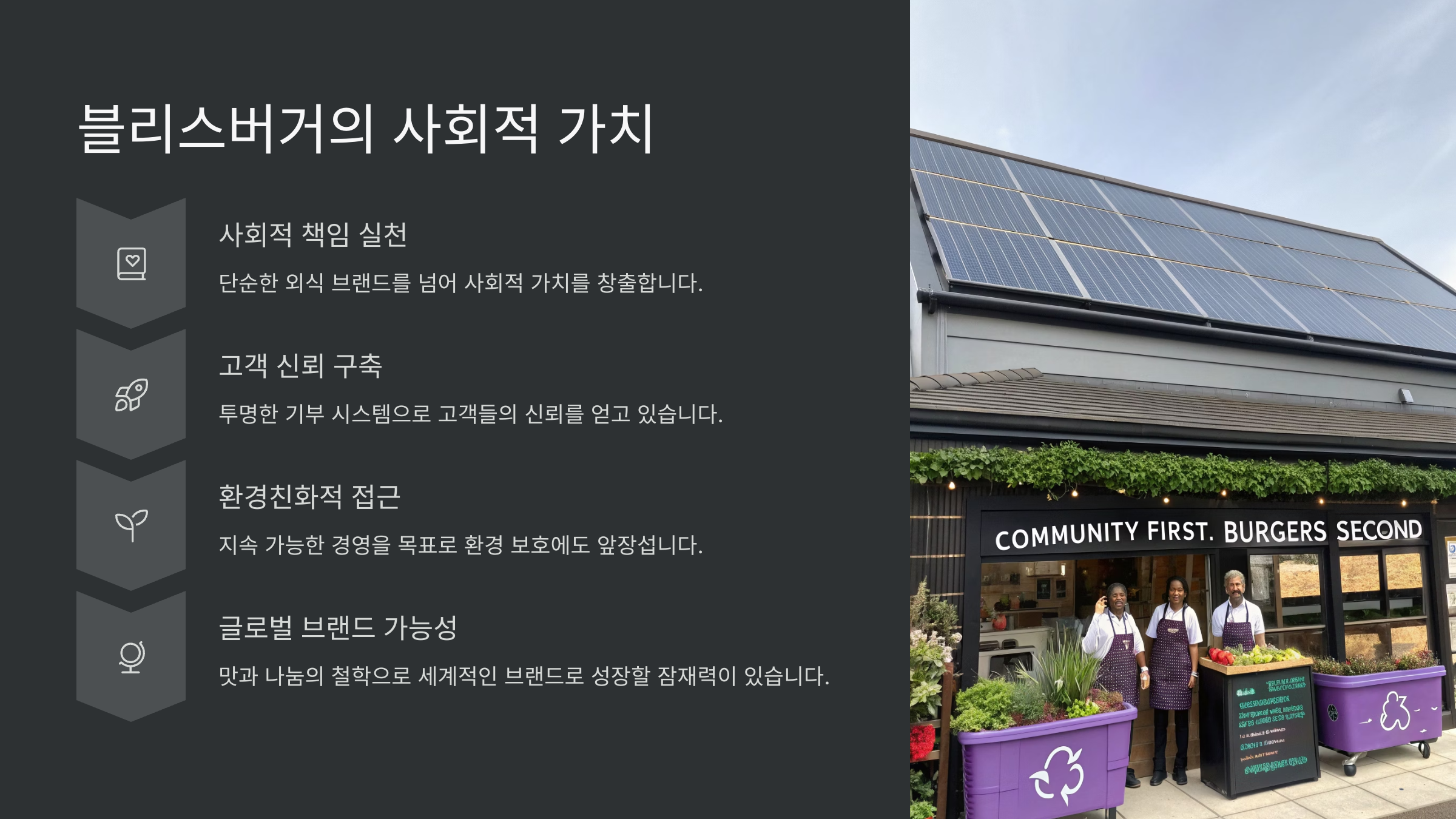 앞으로도 블리스버거는 환경친화적 접근과 지속 가능한 경영을 목표로 나아갈 계획입니다.
