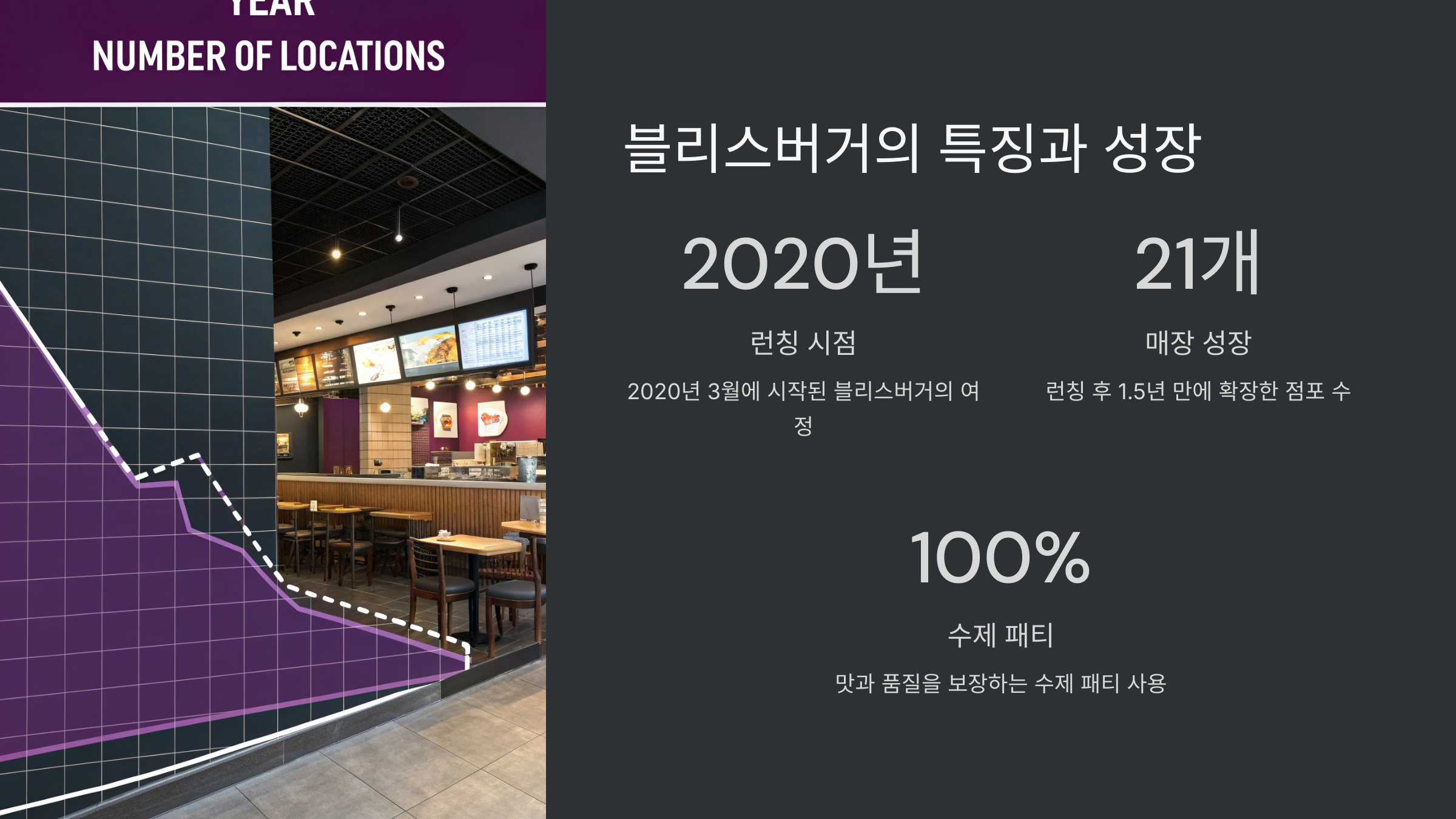 | 런칭 시점 | 매장 성장 | 기부 활동 | 주요 메뉴 |
