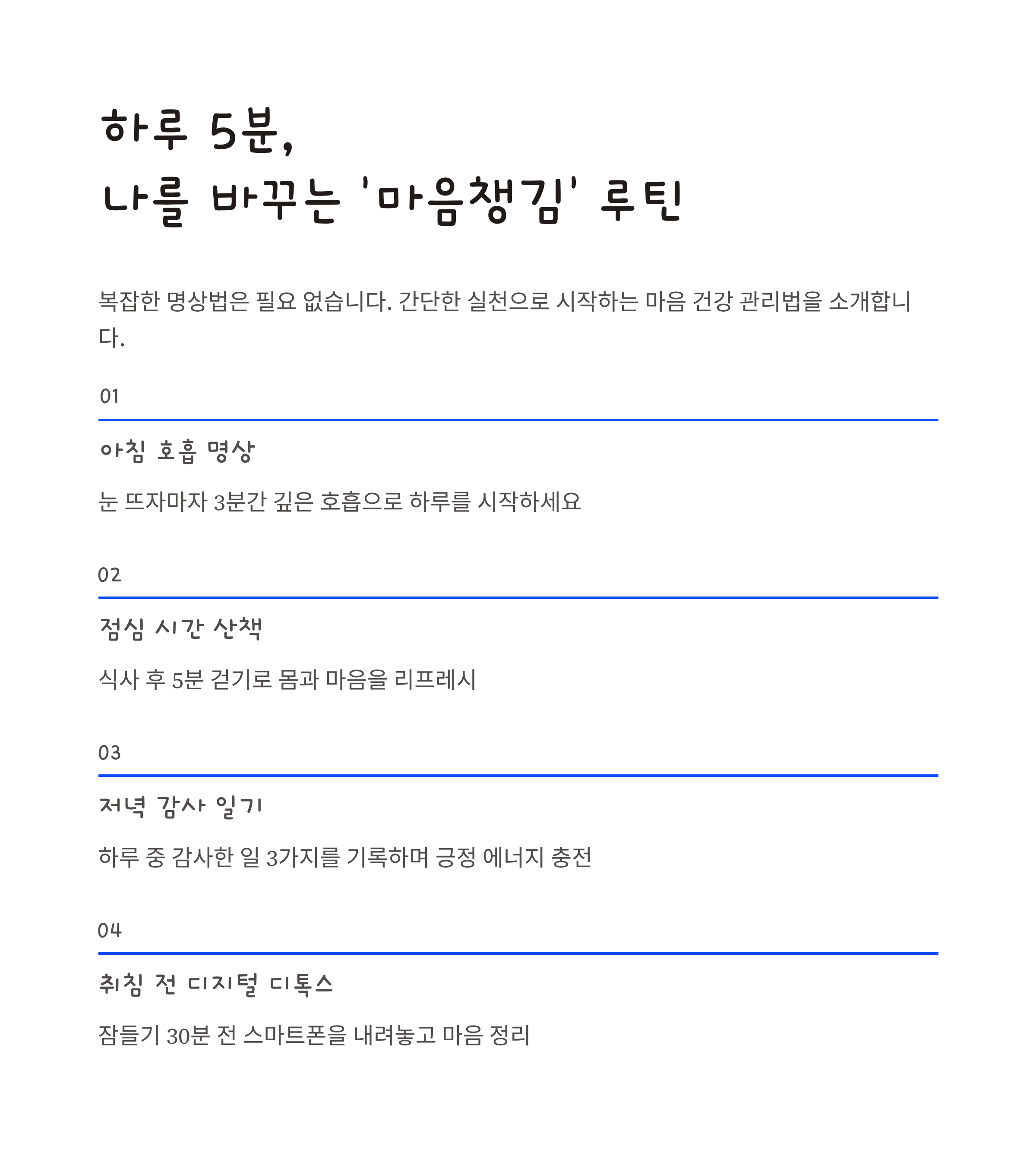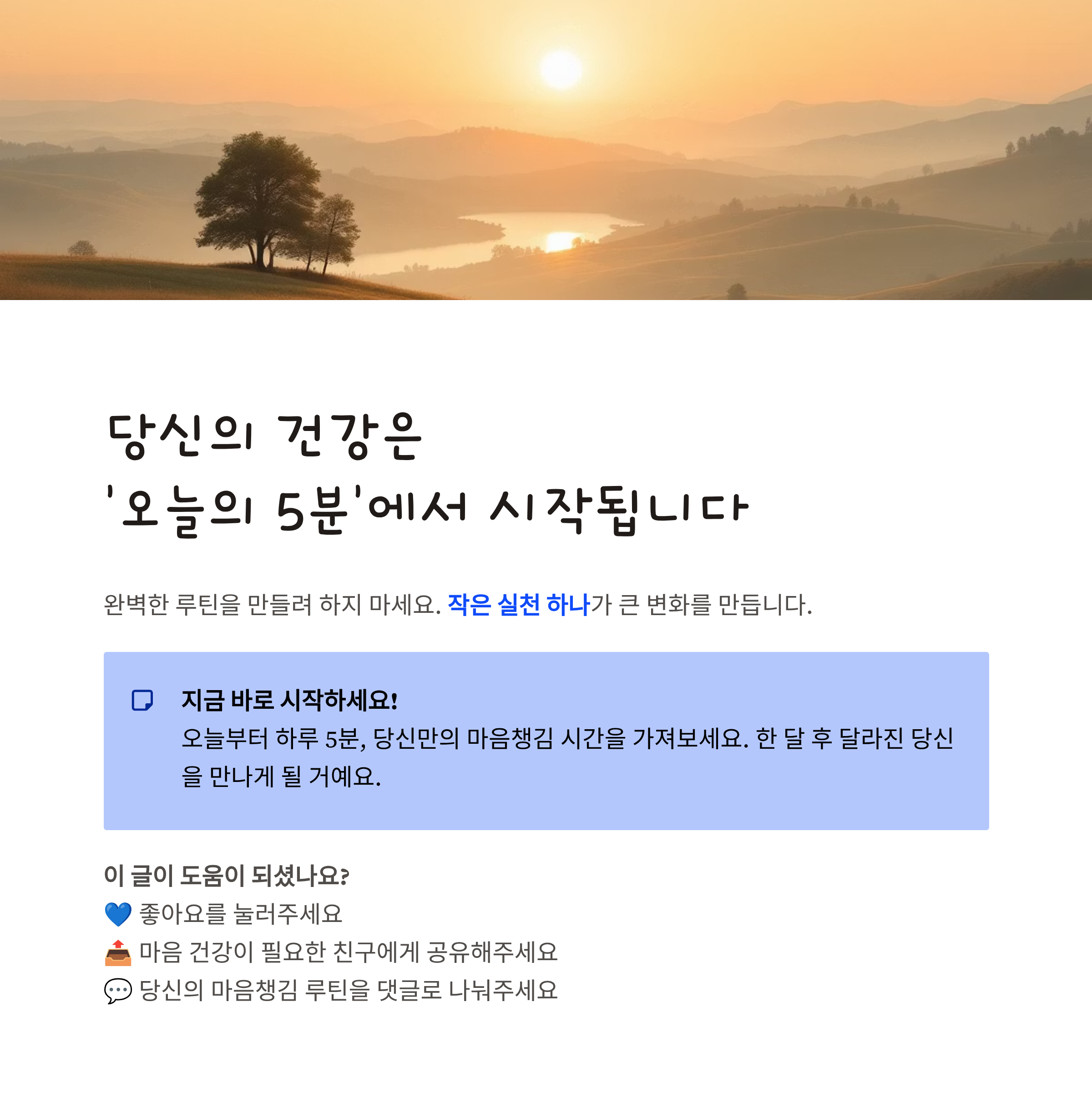 당신의 몸과 마음은 이미 변화할 준비가 되어 있습니다. 지금 바로 5분 루틴으로 '마음챙김'을 시작하고, 일상 속 건강한 변화의 흐름을 만들어 가세요.