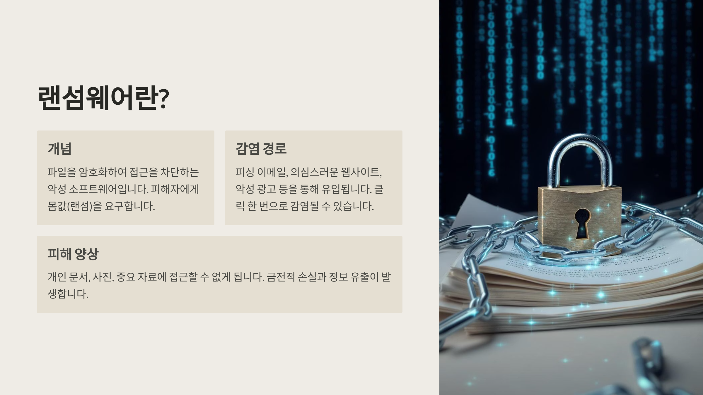 랜섬웨어는 컴퓨터나 서버의 파일을 암호화해 사용할 수 없게 만든 뒤, 복호화(해제)를 조건으로 금전을 요구하는 악성 프로그램입니다. 최근에는 개인, 기업, 공공기관을 가리지 않고 다양한 방식의 랜섬웨어 공격이 급증하고 있습니다.