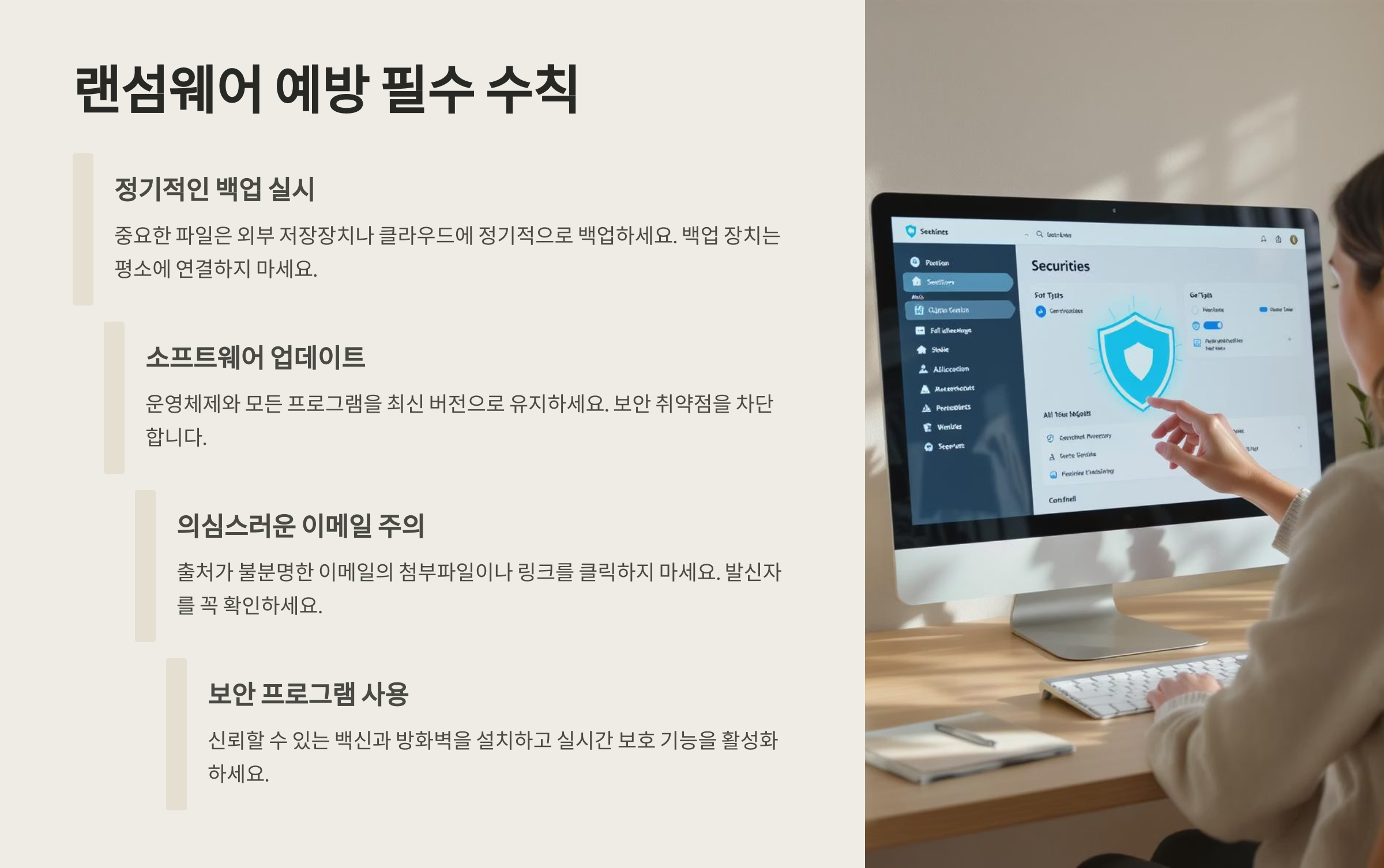 랜섬웨어는 예방이 최선입니다. 한 번 감염되면 복구가 거의 불가능하니, 위 수칙을 반드시 실천하세요.