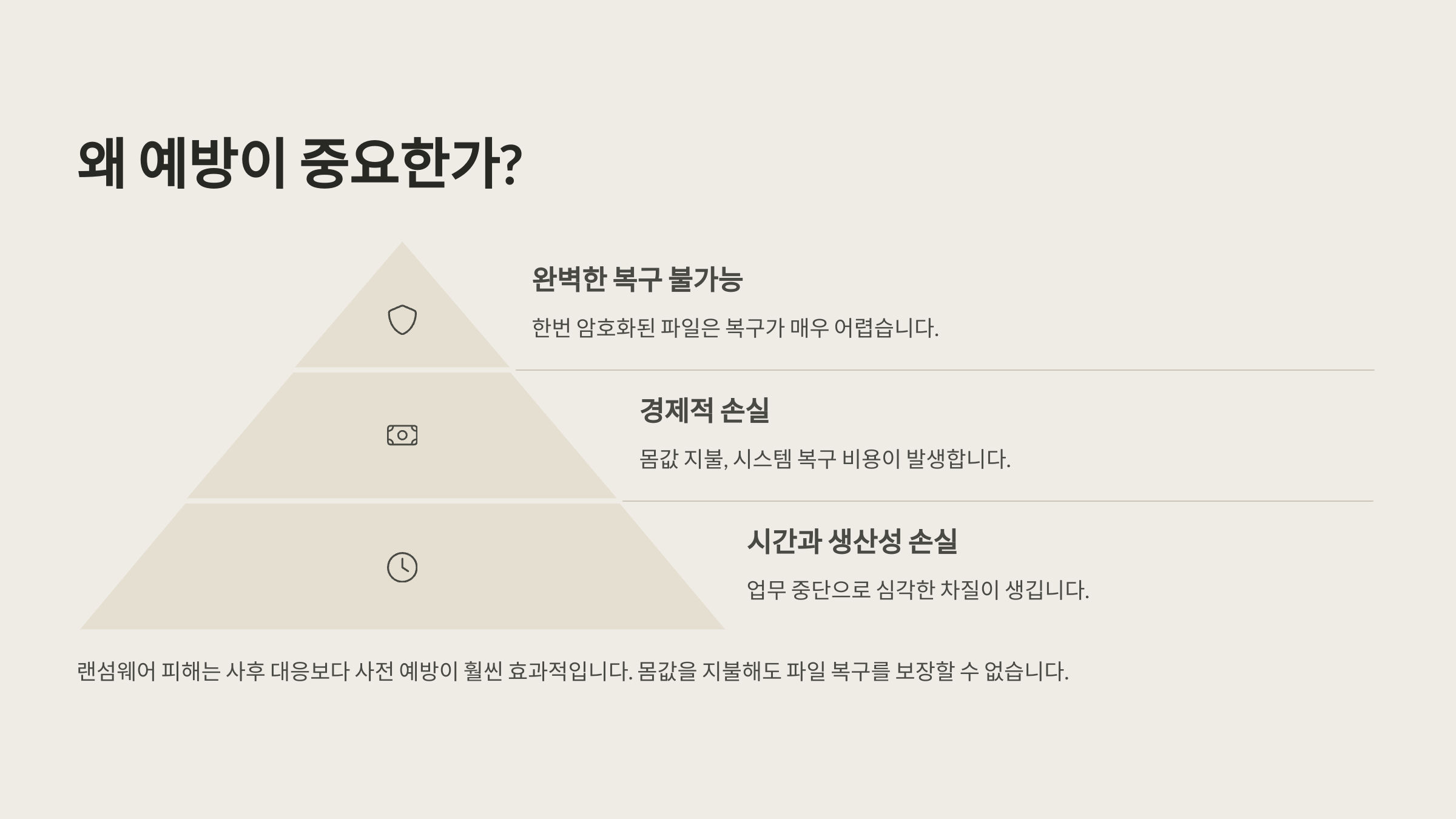 랜섬웨어는 한 번 감염되면 복구가 극히 어렵고, 피해 규모가 매우 큽니다. 예방만이 최선의 방어책이며, 사전 대비가 곧 데이터와 자산을 지키는 지름길입니다.