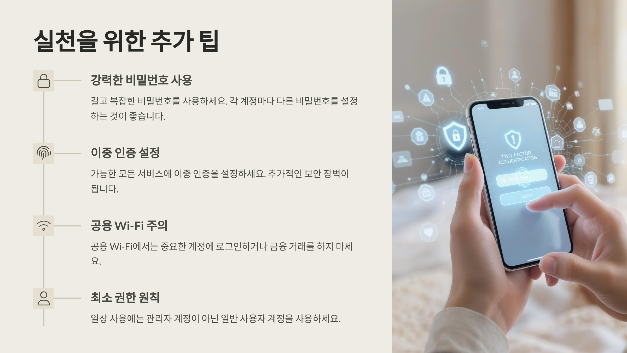 비밀번호만으로는 부족합니다. 추가 인증수단(문자, OTP, 보안토큰 등)을 반드시 설정하세요. - 불필요한 소프트웨어와 서비스는 삭제하거나 비활성화하세요.