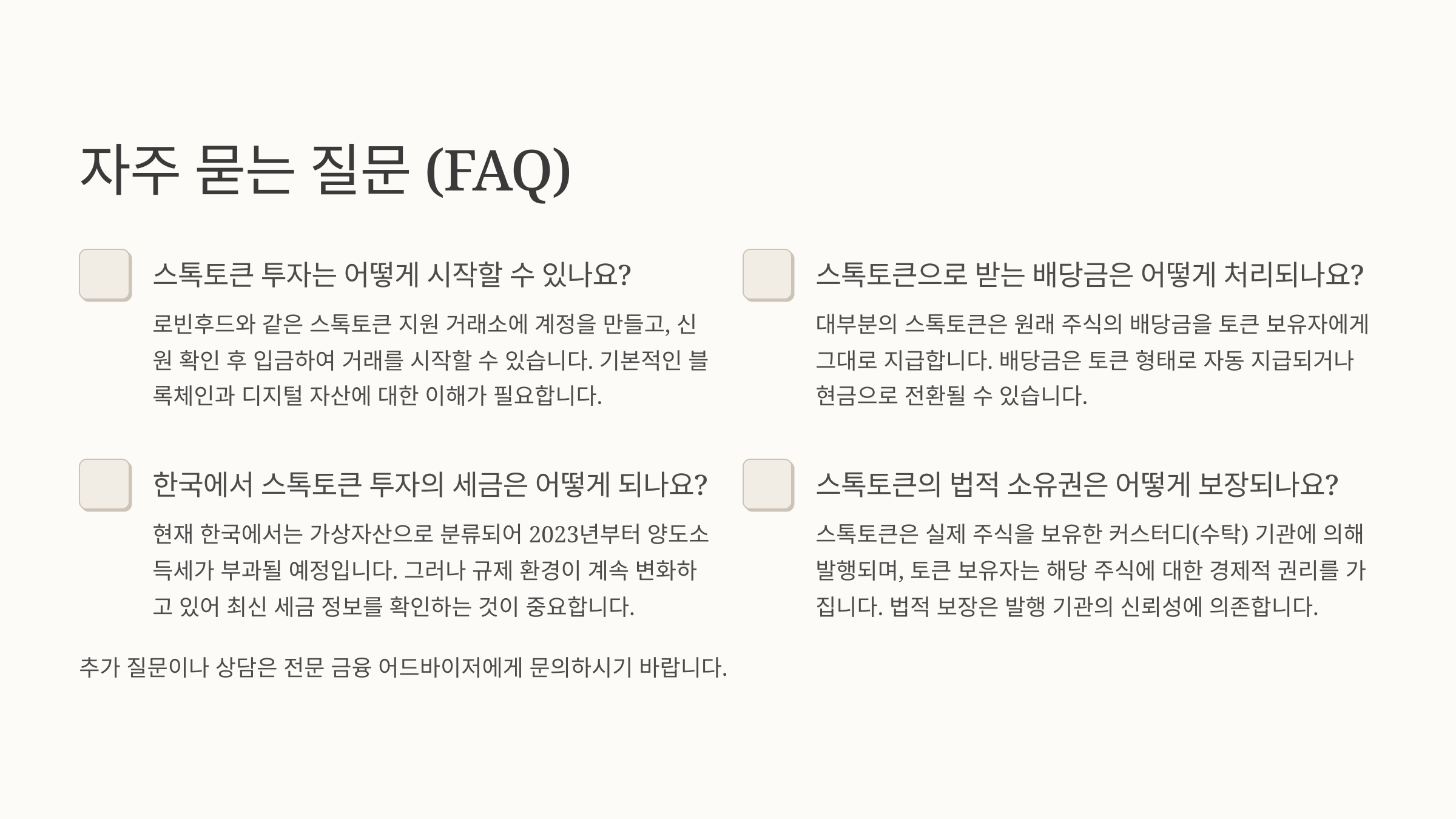 결국 스톡토큰 투자도 주식 투자처럼 ‘정보력’과 ‘신중함’이 중요해요. 무작정 유행 따라가기보다는, 상품 구조와 리스크 요소를 충분히 이해하고 접근하는 게 가장 현명하답니다. 📘