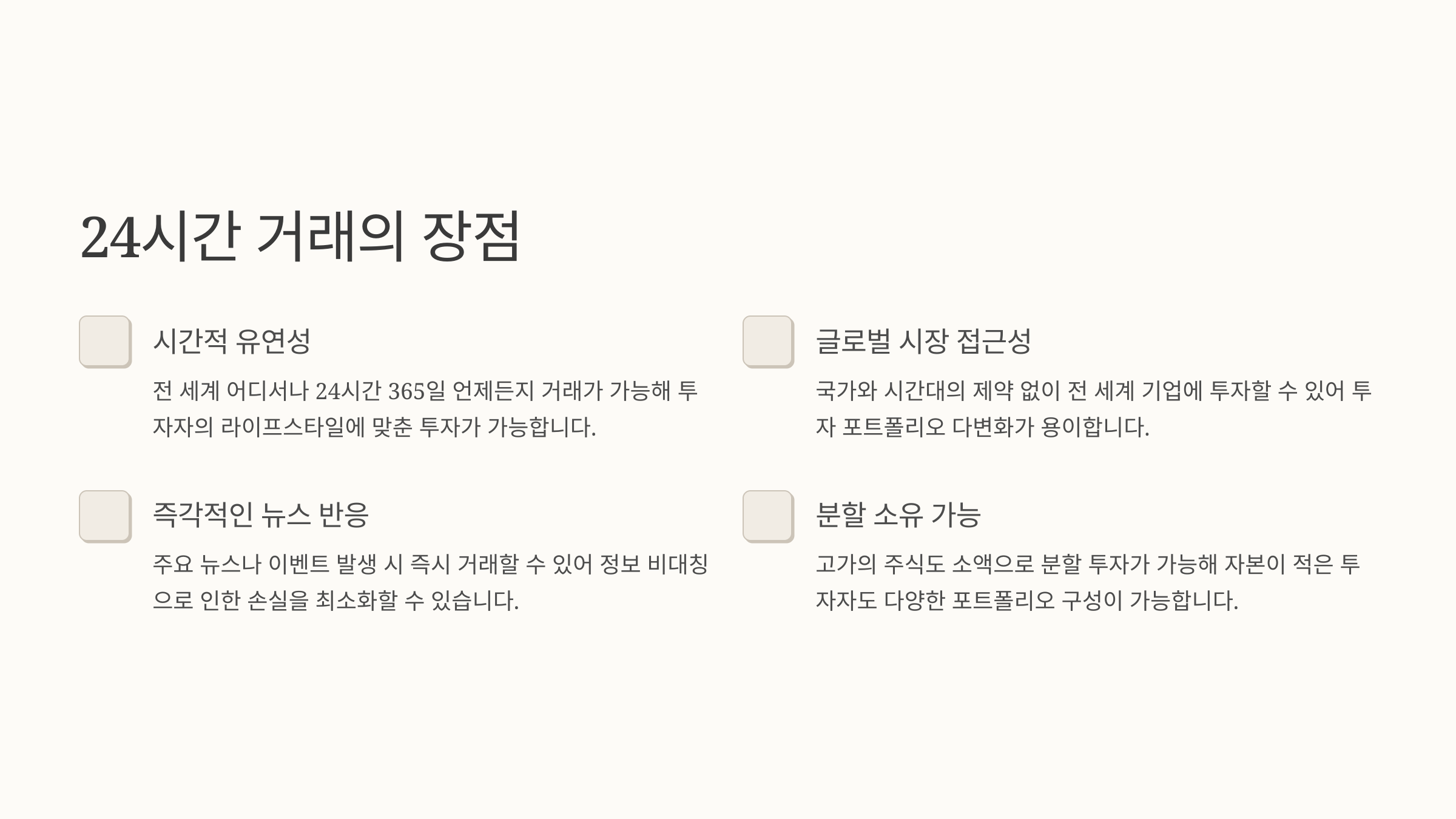 이제 투자자들은 증시 시간에 얽매이지 않고 언제든 투자 결정을 내릴 수 있어요. 이는 단순한 편의성을 넘어서, 위기 대응이나 글로벌 이슈 반응에도 큰 이점을 주는 변화예요.