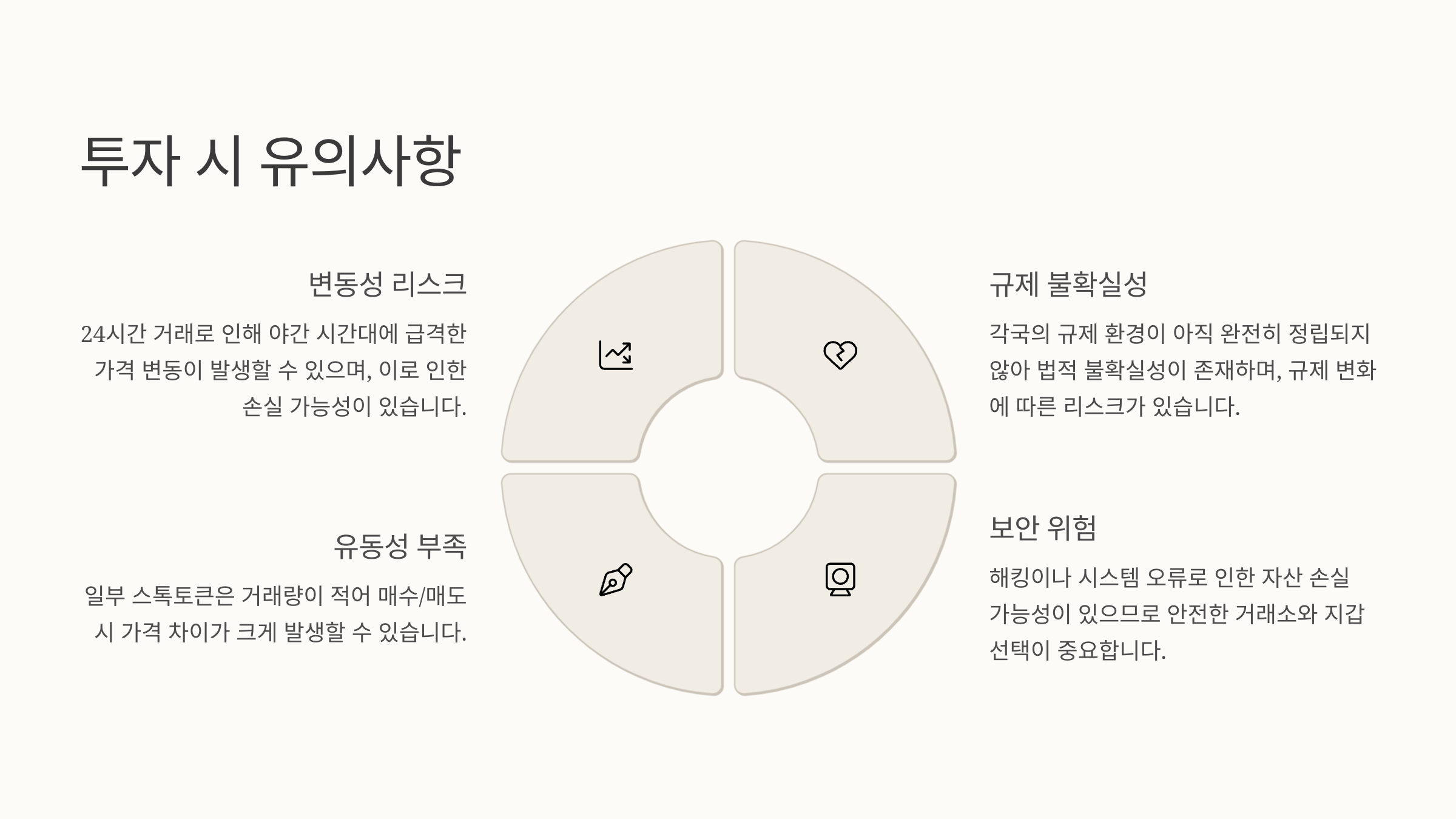 스톡토큰이 매력적인 투자 수단인 건 분명하지만, 모든 금융상품이 그렇듯이 반드시 조심해야 할 부분도 있어요. 아무리 24시간 거래가 가능하고 실시간으로 체결된다 하더라도, 그 이면에는 ‘새로운 위험 요소’가 숨어 있을 수 있거든요. 🤔