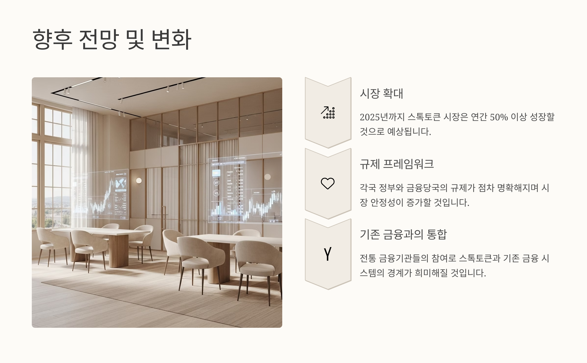 앞으로는 ‘스톡토큰 기반 ETF’나 ‘분산형 투자 포트폴리오 자동화 서비스’ 같은 새로운 금융 상품도 등장할 가능성이 높아요. 단순히 주식을 디지털화하는 데서 멈추지 않고, 투자 전략 자체가 혁신적으로 바뀔 수 있다는 거예요. ⚙️
