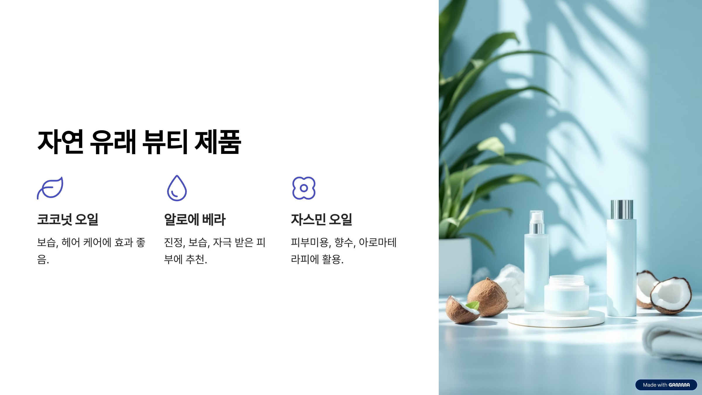 | 코코넛 오일 | 필리핀 | 보습, 모발 보호 | 헤어오일, 바디로션 |