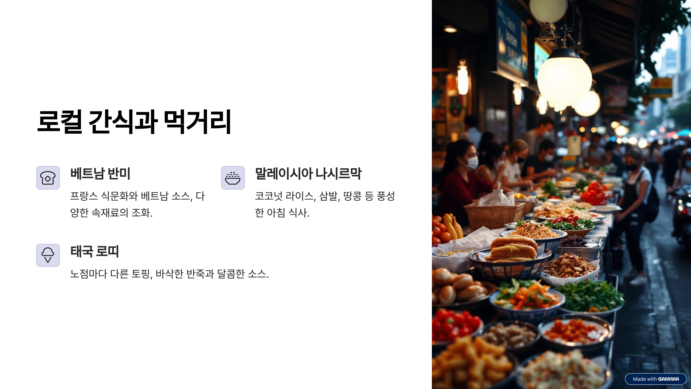 동남아 시장에서 빠질 수 없는 즐거움이 바로 현지 간식을 맛보는 일이에요. 시장 골목마다 달콤하고 고소한 향이 퍼지고, 지나가기만 해도 군침이 돌게 만드는 간식들이 잔뜩 펼쳐져 있거든요. 태국의 코코넛 팬케이크 ‘칸롬크록’, 베트남의 바삭한 튀김 스낵 ‘반찌엣’, 필리핀의 바나나칩 같은 대표 간식들은 여행자들 사이에서도 입소문 난 베스트 아이템이에요.