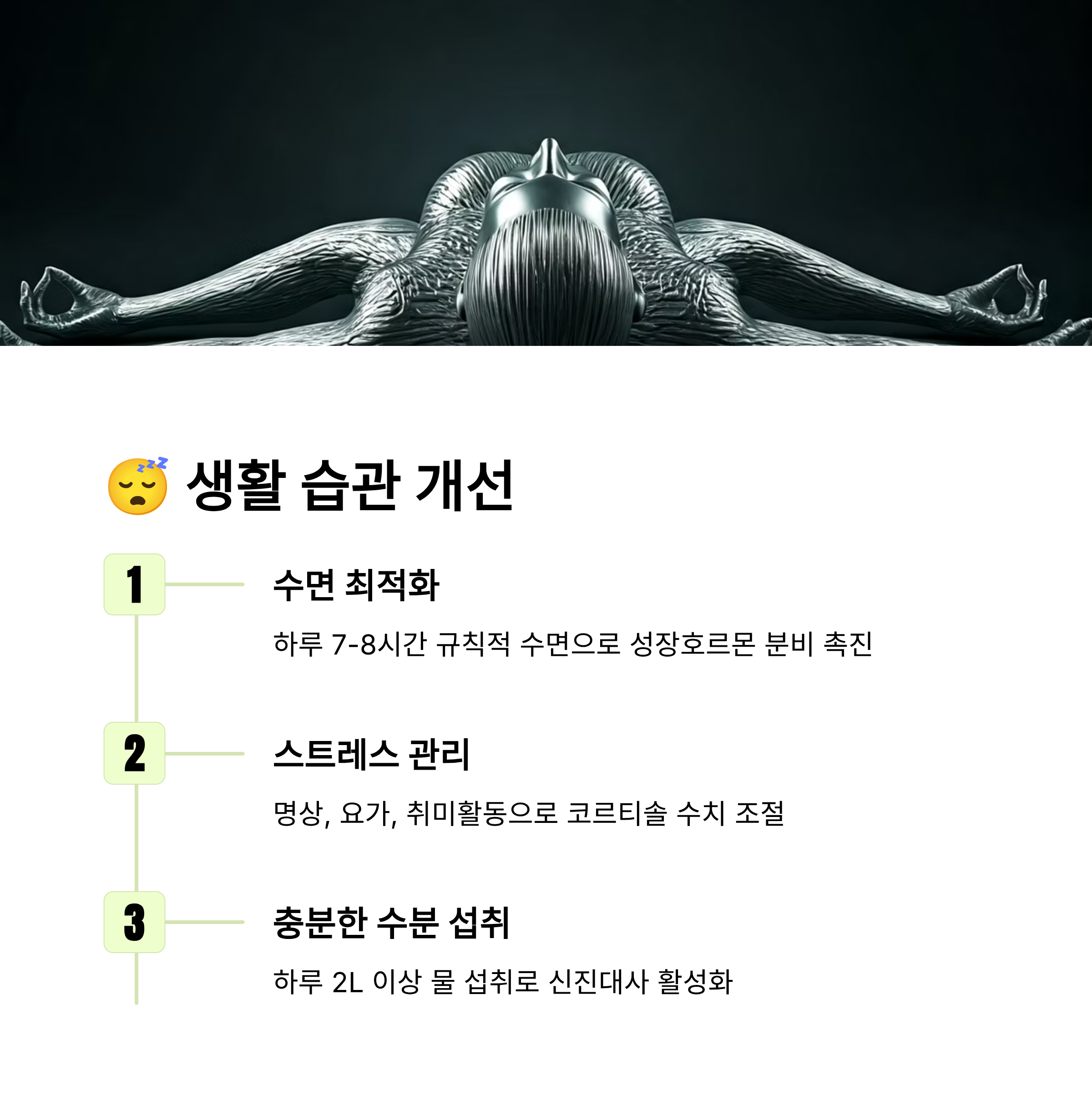 | 생활 습관 | 충분하고 규칙적인 수면, 스트레스 관리, 금연/절주 | 호르몬 균형 유지, 내장지방 축적 억제 |