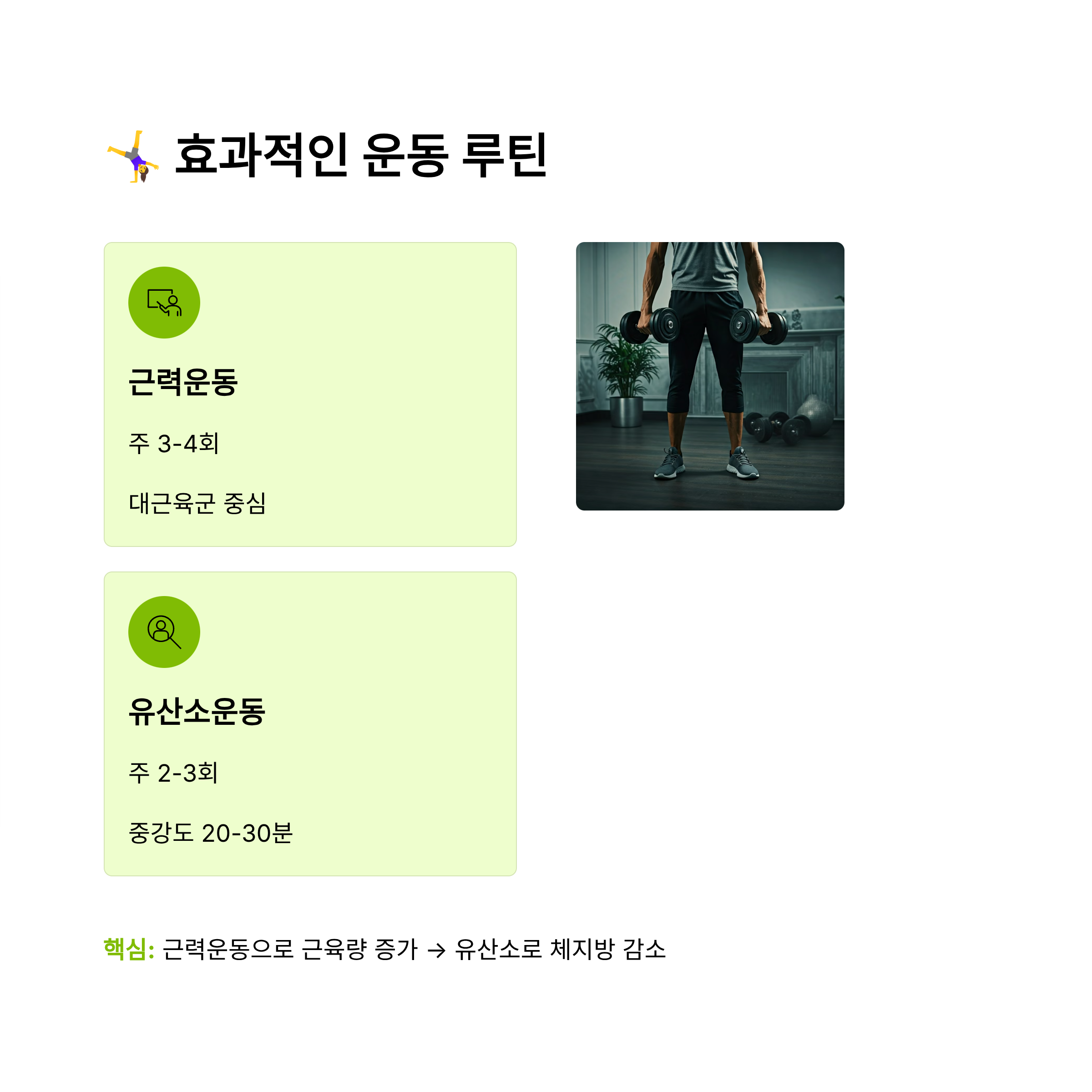| 운동 | 근력 운동(주 2~3회) + 유산소 운동(주 3~5회) 병행 | 기초대사량 증진, 체지방 연소, 근육량 확대 |