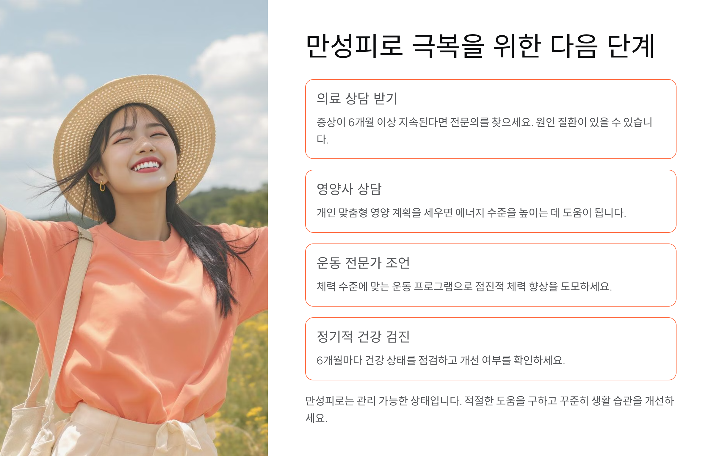A. 2주 이상 극심한 피로가 지속되거나 일상생활에 지장이 있다면 반드시 전문의 상담과 검사가 필요합니다. - Q. 운동이 오히려 피로를 악화시키지 않나요?