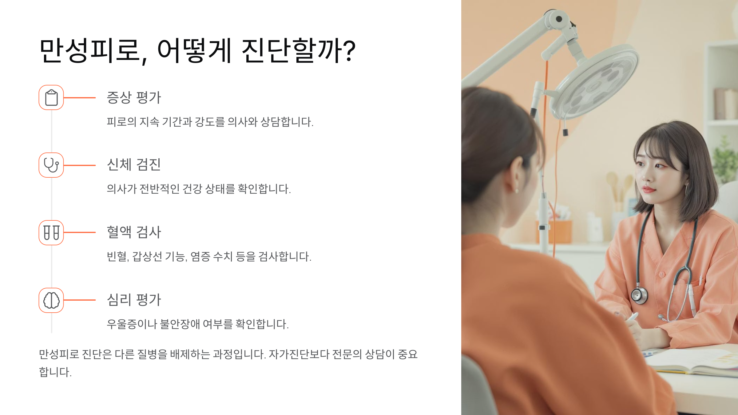 만성피로의 원인은 다양하므로, 단순히 피로만으로 자가진단하지 말고 정확한 진단을 받는 것이 중요합니다.