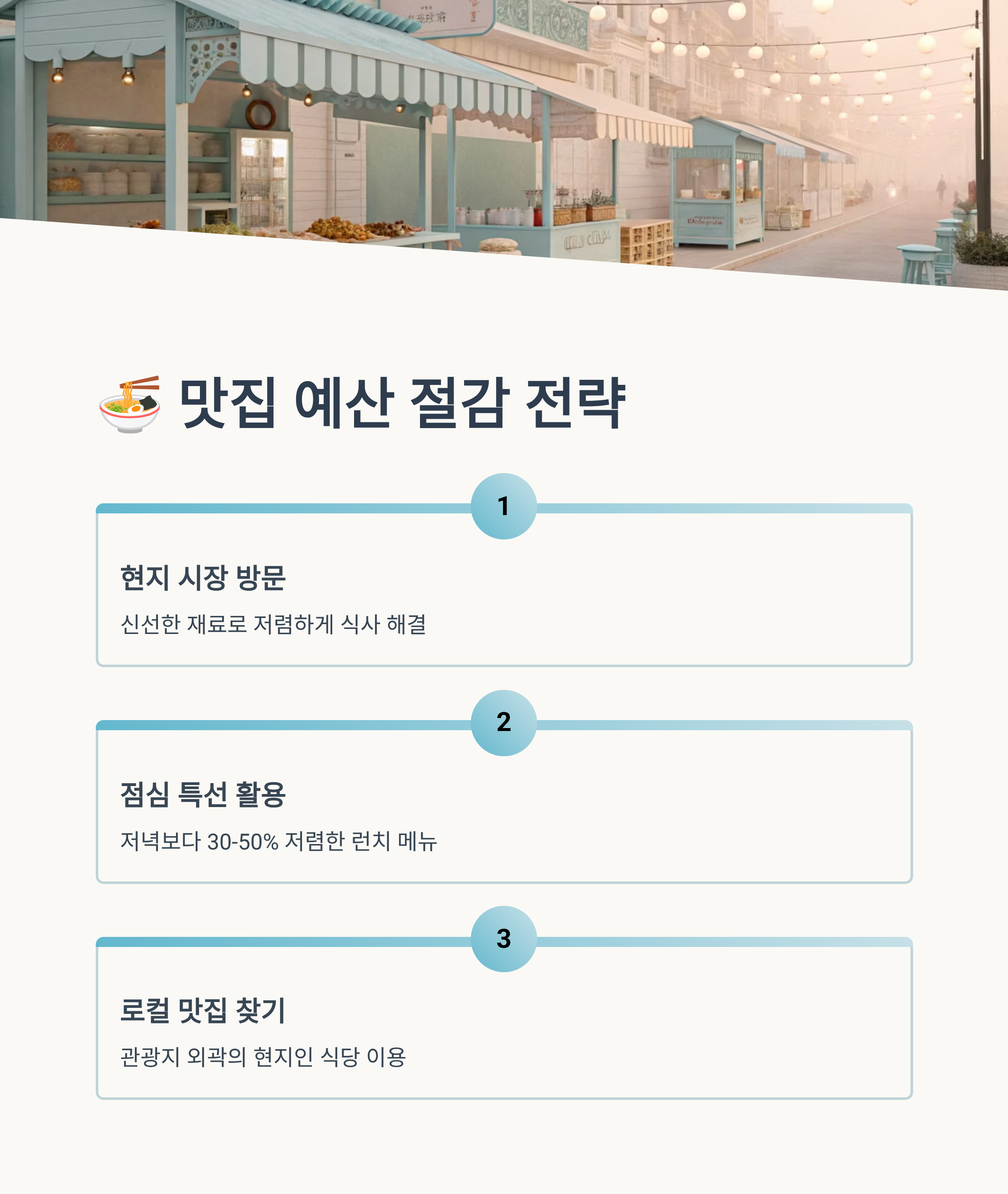 - 현지 시장 및 길거리 음식 활용: 현지 시장의 길거리 음식이나 작은 식당은 저렴하면서도 그 나라의 진짜 맛을 느낄 수 있는 최고의 선택입니다.