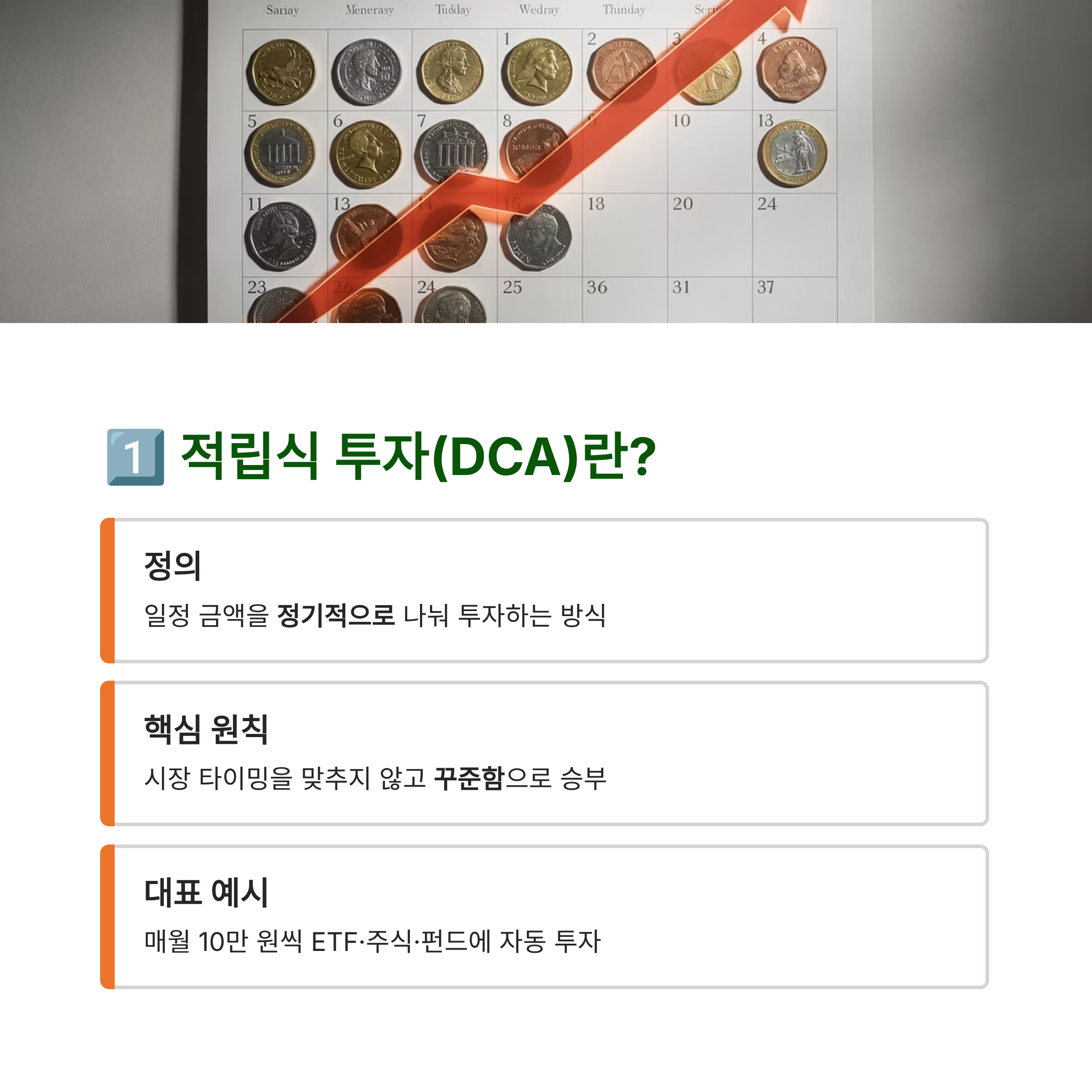 1) 적립식 투자(DCA)의 기본 원리 2) 코스트 에버리지(평균단가 하락) 효과 3) 거치식 투자 vs 적립식 투자 비교 4) 하락장에서 빛을 발하는 이유 5) 성공적인 적립식 투자를 위한 3계명1) 적립식 투자(DCA)의 기본 원리