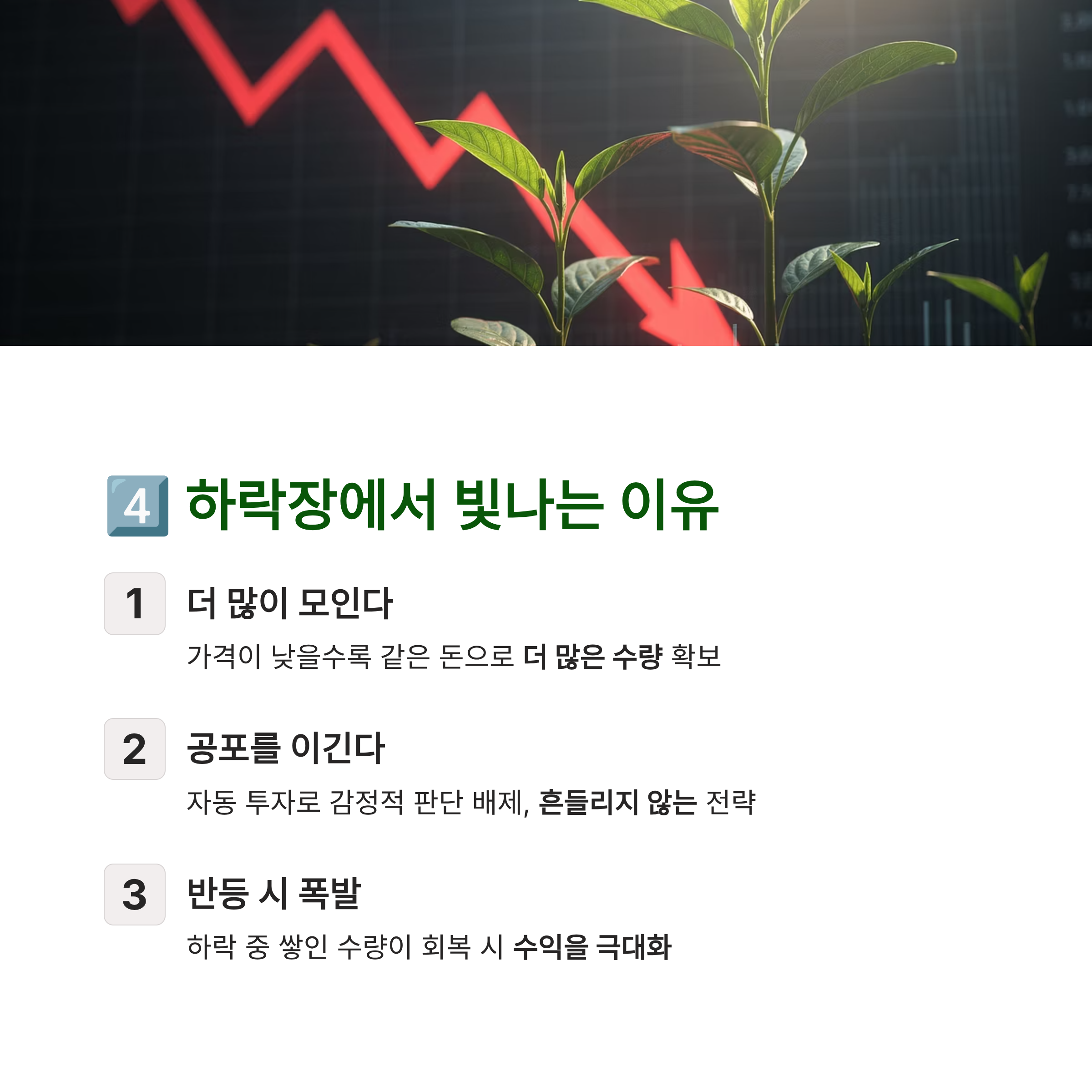 시간이 지날수록 수량은 쌓이고 평균 단가는 안정화되는 효과를 얻습니다.