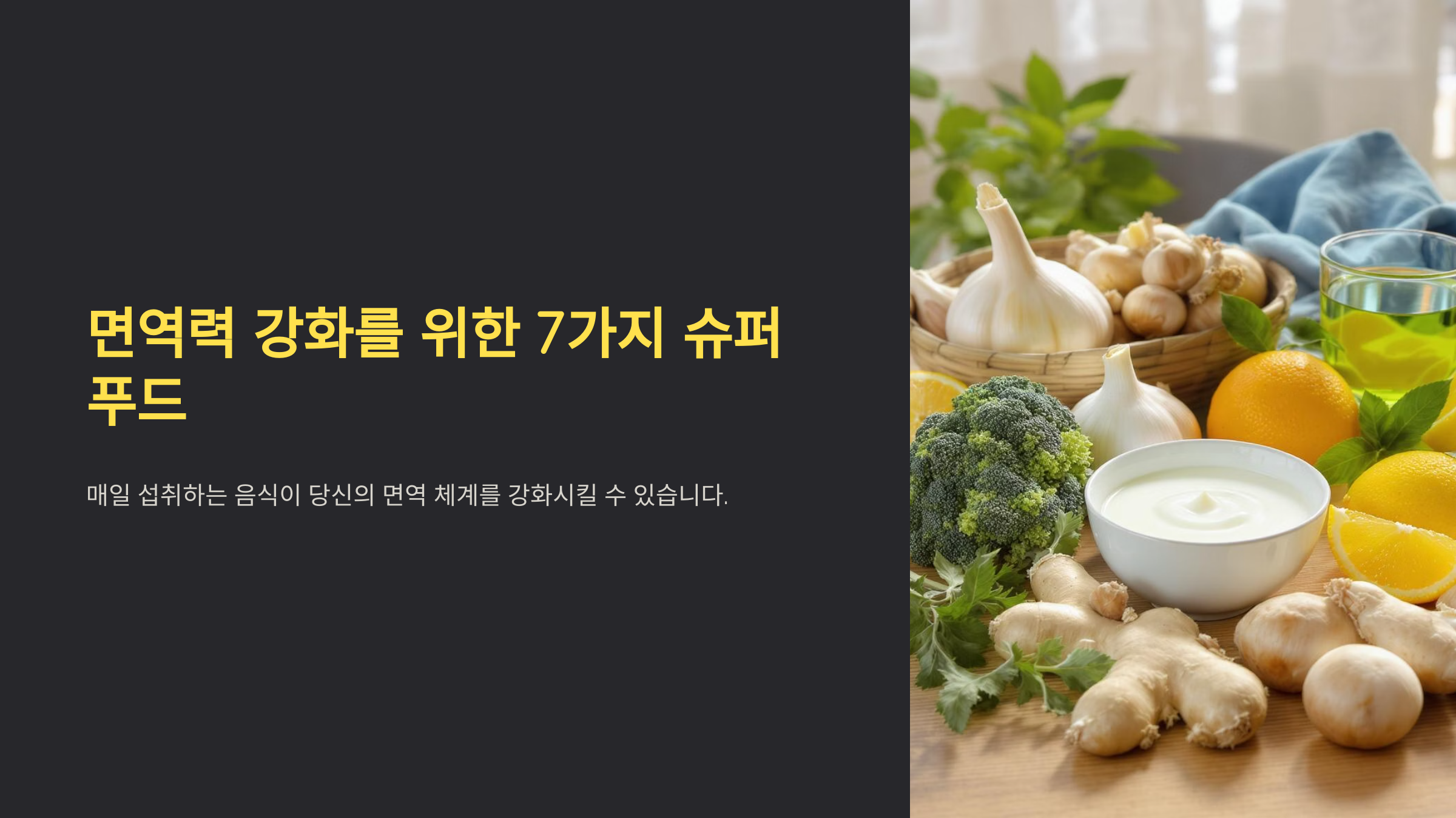 그래서 요즘은 식단부터 싹 바꾸고 있답니다. 오늘은 저처럼 면역력이 걱정되는 분들을 위해, 우리 몸을 건강하게 지켜주는 면역력 강화 식품 7가지를 소개해드릴게요!