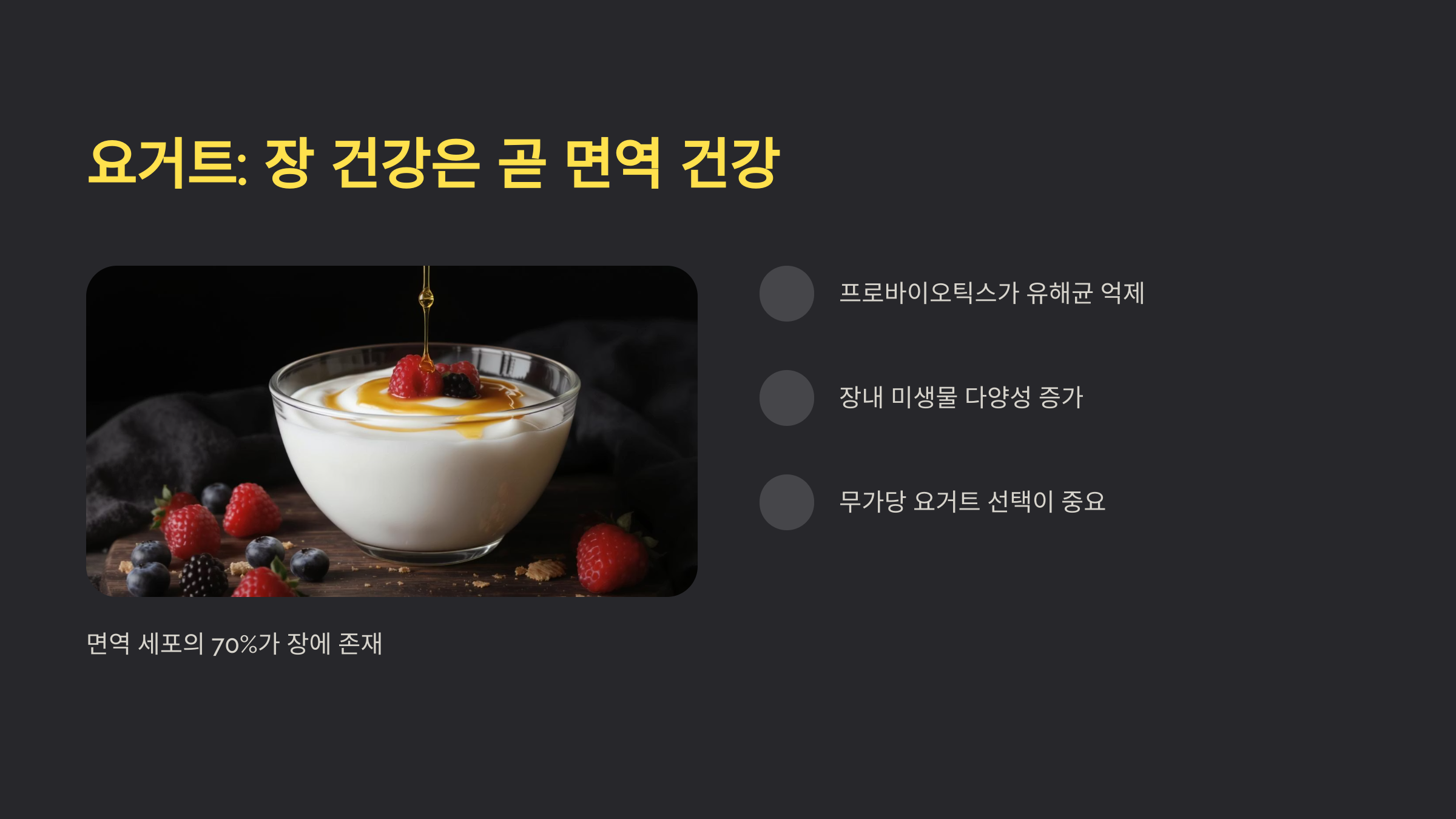 면역력의 70% 이상이 장에서 시작된다는 말, 들어보셨나요? 바로 그래서 프로바이오틱스가 풍부한 요거트가 중요한 거예요. 유익균이 장내 환경을 정돈해주고, 해로운 세균이 자리잡지 못하게 막아준답니다. 플레인 요거트를 기본으로 해서 과일, 견과류 등을 넣어 먹으면 더욱 좋고요. 단, 설탕이 많이 들어간 제품은 오히려 장내 세균 균형을 해칠 수 있으니 주의하세요.