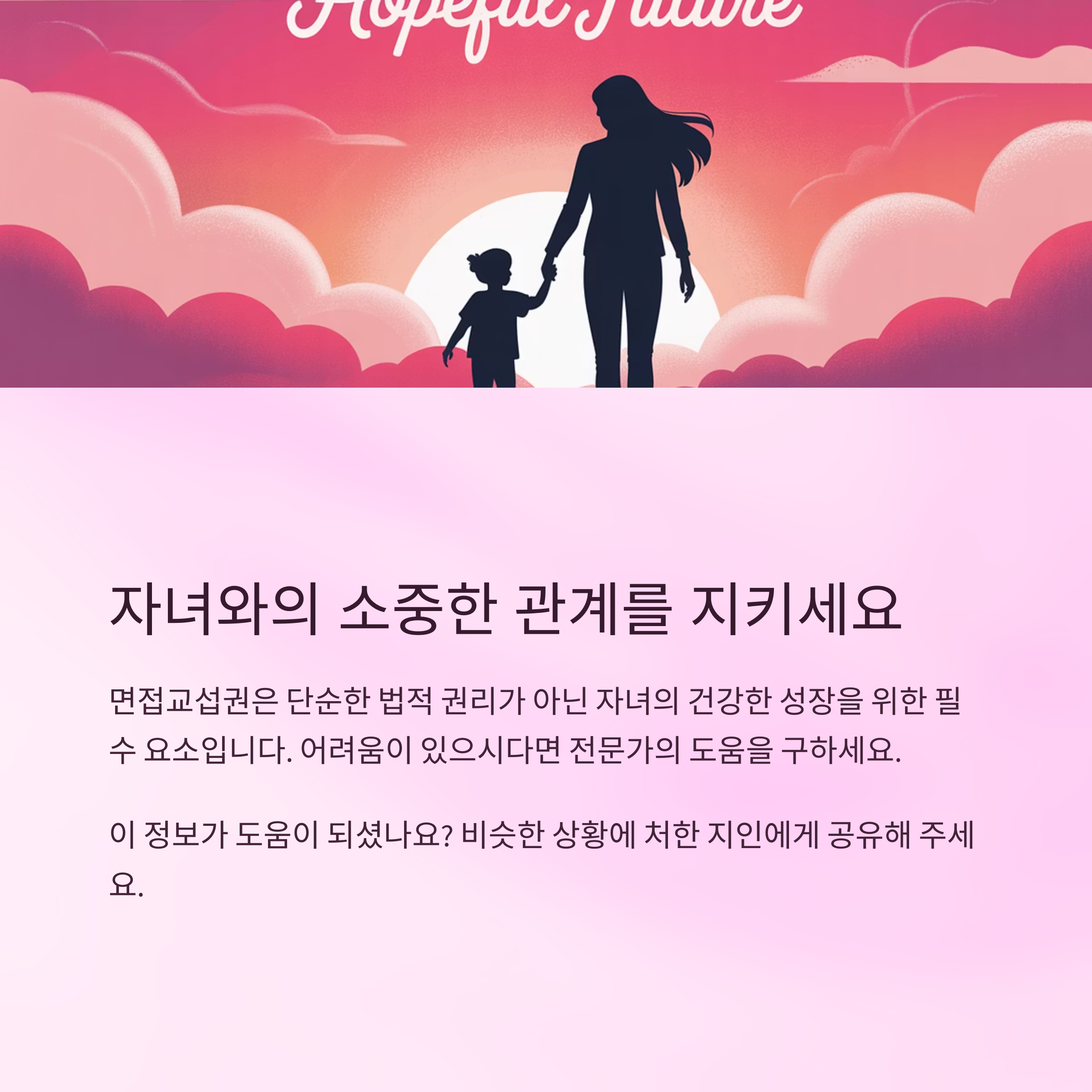 제가 생각했을 때, 면접교섭권은 이혼이라는 아픔 속에서도 '자녀 중심'의 원칙을 지키기 위한 중요한 안전장치라고 봐요. 거부 상황에서는 감정적으로 대응하기보다, 자녀의 행복을 최우선으로 생각하며 합리적인 해결책을 찾는 것이 중요합니다.