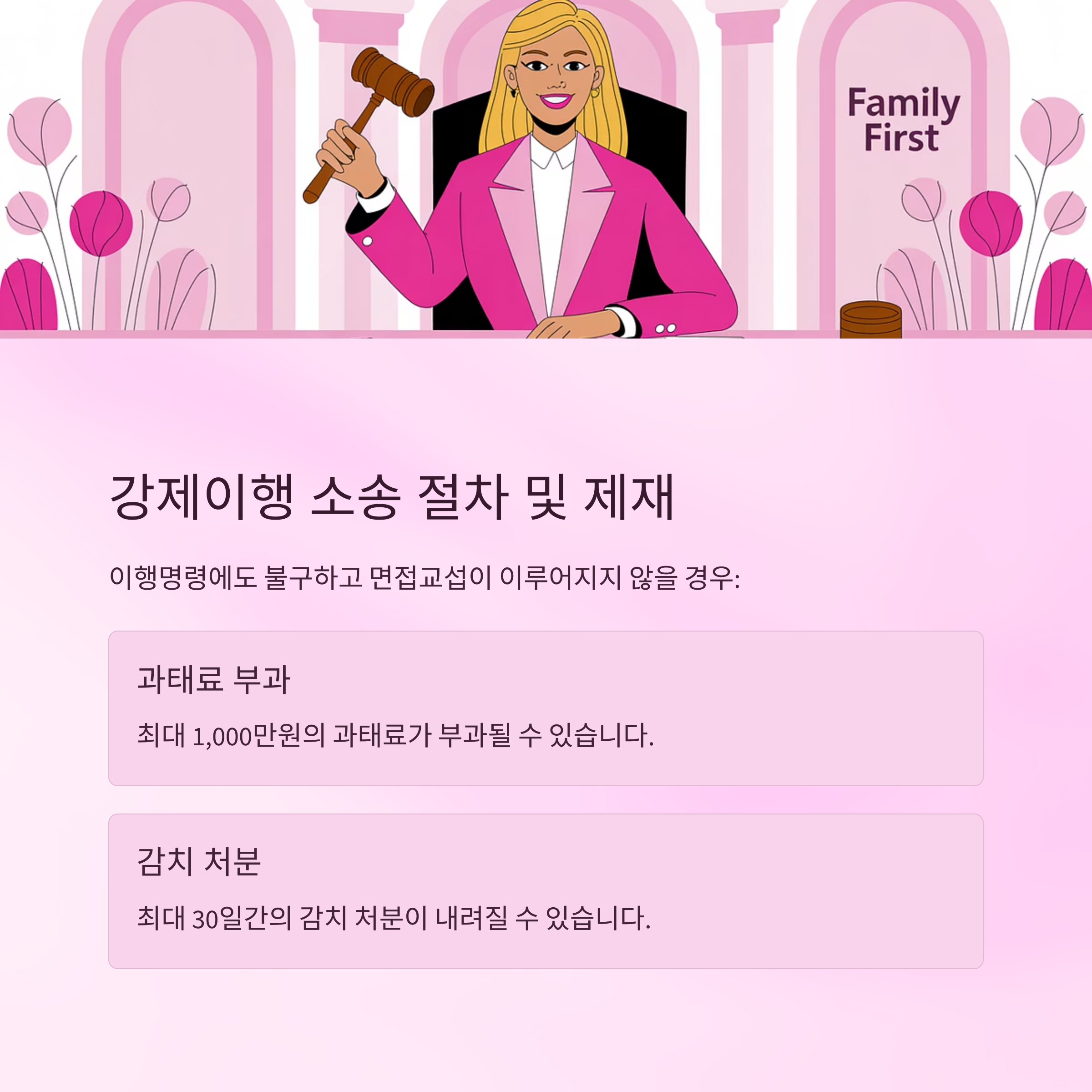 이행명령에도 불구하고 양육권자가 면접교섭을 계속 거부한다면, 비양육권자는 법원에 '강제이행 소송'을 제기하여 과태료 부과나 감치 처분 등의 제재를 요청할 수 있어요. 이는 면접교섭권 이행을 강제하는 가장 강력한 법적 수단입니다.